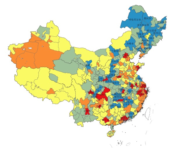 红色和黄色表示人口正增长,蓝色和绿色表示人口负增长。