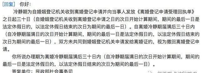 冷静期为自婚姻登记机关收到离婚登记申请并向当事人发放《离婚登记申请受理回执单》之日起三十日(自婚姻登记机关收到离婚登记申请之日的次日开始计算期间,期间的最后一日是法定休假日的,以法定休假日结束的次日为期间的最后一日)。自离婚冷静期届满后三十日内(自冷静期届满日的次日开始计算期间,期间的最后一日是法定休假日的,以法定休假日结束的次日为期间的最后一日),双方未共同到婚姻登记机关申请发给离婚证的,视为撤回离婚登记申请。