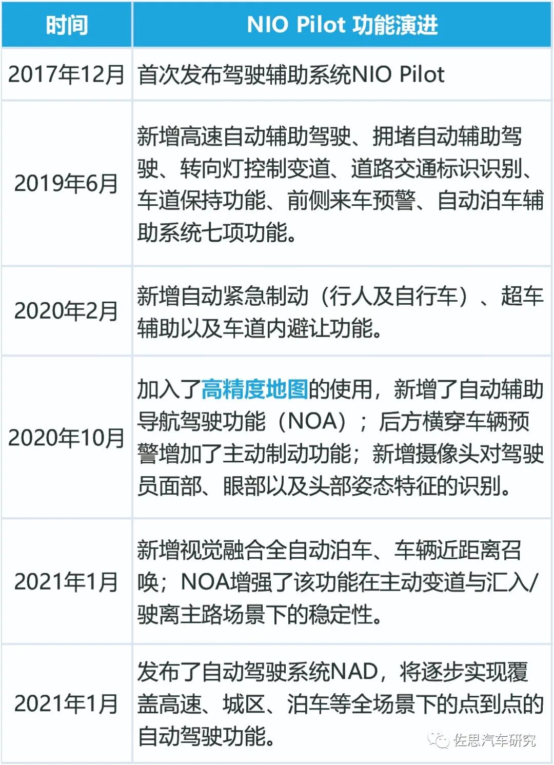 2021年1-6月份,蔚来汽车整体销量为4.1万辆,其中标配高精度地图的车辆0.22万辆,选配车辆0.54万辆,品牌整体装配率为18.5%。分车型来看,蔚来EC6的装配率最高,车型装配率29.2%。2020年10月,蔚来NIO Pilot系统加入高精度地图的使用,新增自动辅助导航驾驶功能(NOA)。2021年1月,发布自动驾驶系统NAD,将逐步实现覆盖高速、城区、泊车等全场景下的点到点的自动驾驶功能。搭载车型:蔚来 2020款全系签名版,2019款 首发纪念版标配;2020款ES6和EC6的运动版、性能版,2020款ES8六座版、七座版可选配。实现功能:主要用于蔚来NOP(自动辅助导航驾驶)。结构化道路(指高速公路、城市快速路等)上自动驶入/出匝道口、自动变道、调整车速。以 「驶出匝道口」为例,NOP会在车辆开到匝道口前 2-2.5 公里处开始向最右侧的车道并线,然后跟车驶出匝道)![]()
