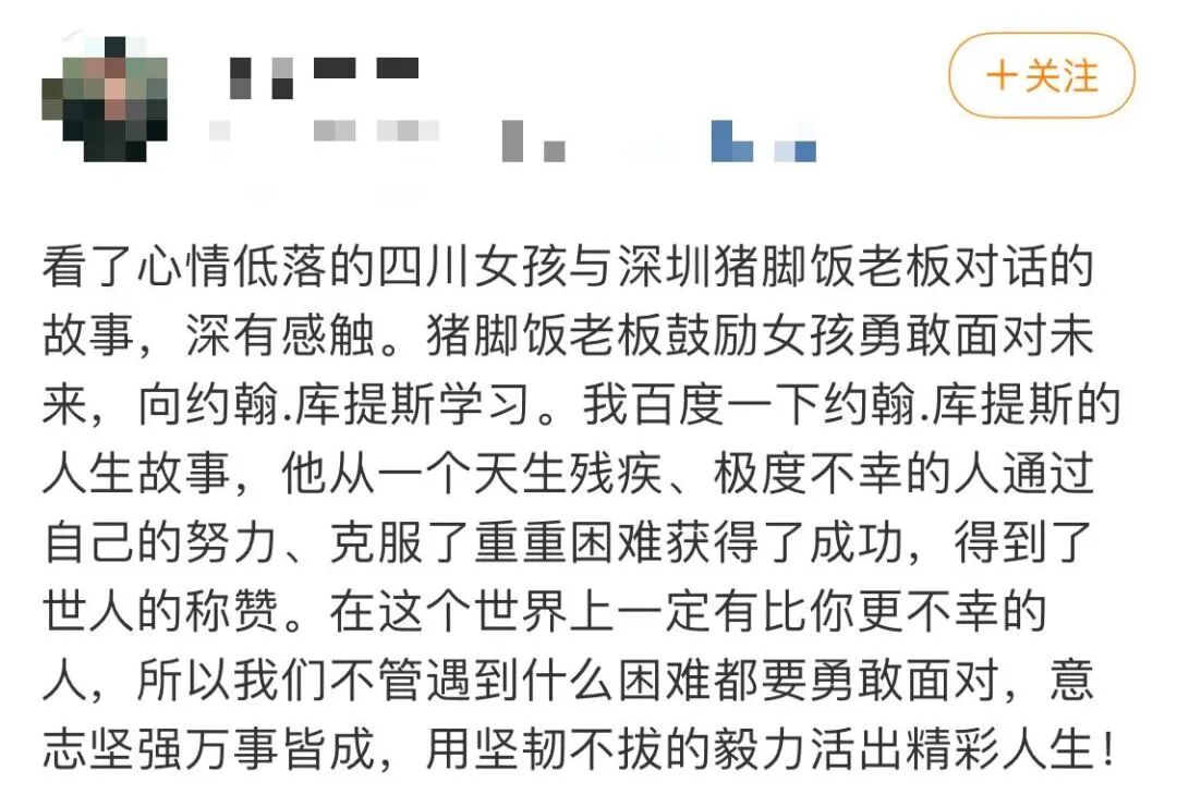 最后,肖祥金祝愿女孩能够走出阴霾,心向光明。他借用网络流行语说道:“生活上没有什么事不是一顿猪脚饭解决不了的,不行咱就来两顿。”