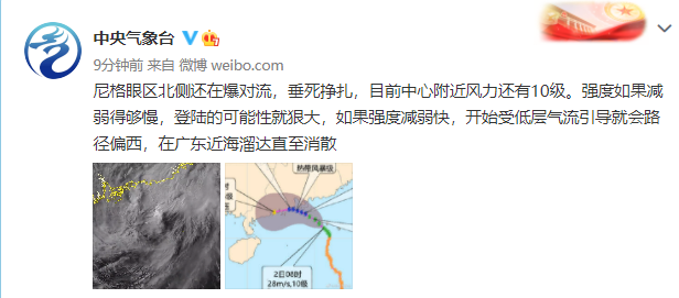“尼格”(强热带风暴级)的中心今天(11月2日)上午10点钟位于广东省台山市东偏南方向大约320公里的南海东北部海面上,中心最低气压为982百帕。预计,“尼格”将以每小时15公里左右的速度向西北方向移动,强度逐渐减弱,并将于3日早晨到上午在广东珠海到阳江一带沿海登陆(热带低压或热带风暴级,7-8级,15-18米/秒),也有可能于3日白天在广东西部近海减弱消散。据中央气象台,“尼格”眼区北侧还在爆对流,垂死挣扎,目前中心附近风力还有10级。强度如果减弱得够慢,登陆的可能性就很大,如果强度减弱快,开始受低层气流引导就会路径偏西,在广东近海溜达直至消散。