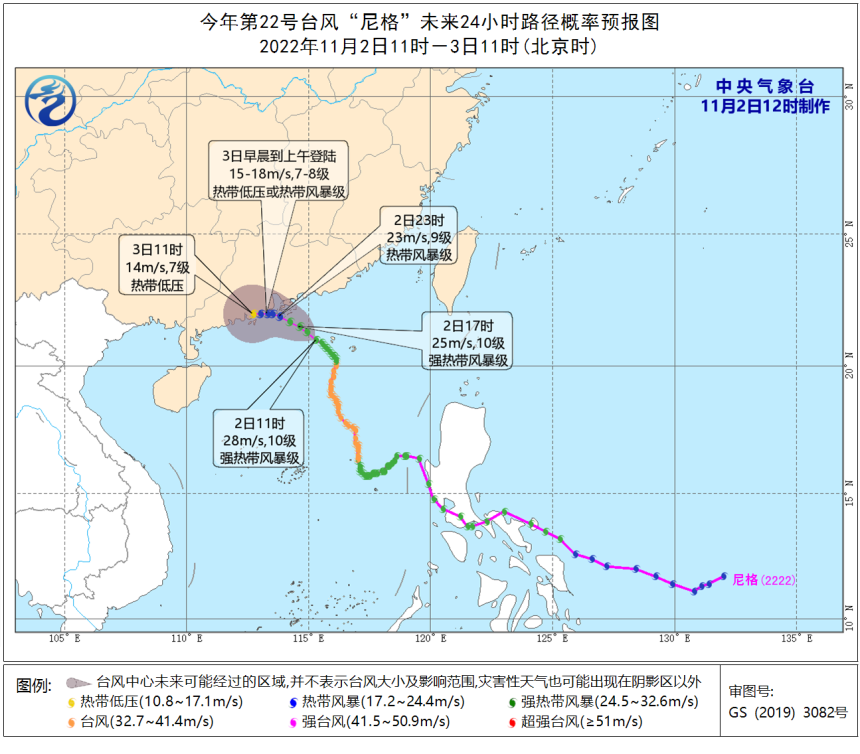大风预报:11月2日14时至3日14时,受“尼格”和冷空气的共同影响,台湾海峡、南海北部偏北海域、浙江沿海、福建沿海、台湾岛沿海、广东中部和东部沿海将有7-8级大风,其中台湾海峡部分海域、南海北部偏北的部分海域、珠江口附近及其沿海、香港沿海、广东东部沿海将有9-10级大风,阵风可达11-12级。