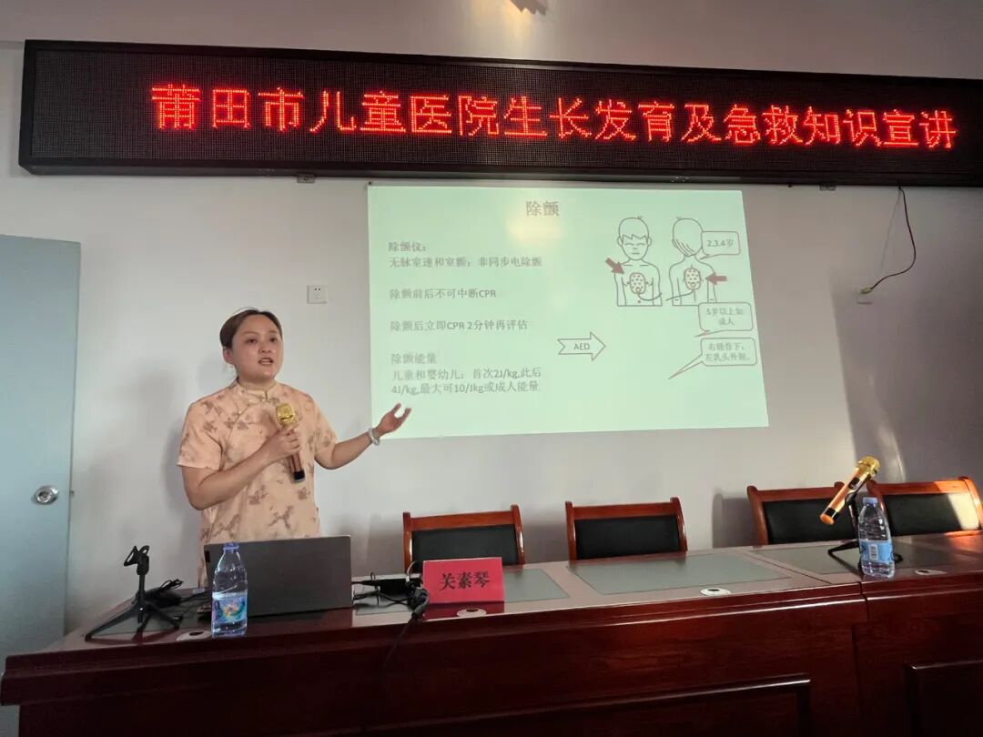 莆田学院附属医院老院区儿科胡剑清主治医师现场示范儿童心肺复苏,详细介绍了儿童心搏骤停的常见原因,并现场演示开放气道、人工呼吸、心脏按压及AED除颤仪的使用,通过系统的步骤拆分讲解演示,让现场医务人员更直观深刻掌握儿童心肺复苏急救操作。