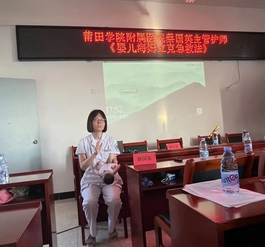 莆田学院附属医院老院区急诊科蔡国英主管护师以日常生活常见育儿突发事件为切入点,利用婴儿模型,通过背部叩击联合胸部冲击法为大家进行婴儿海姆立克的现场示范。