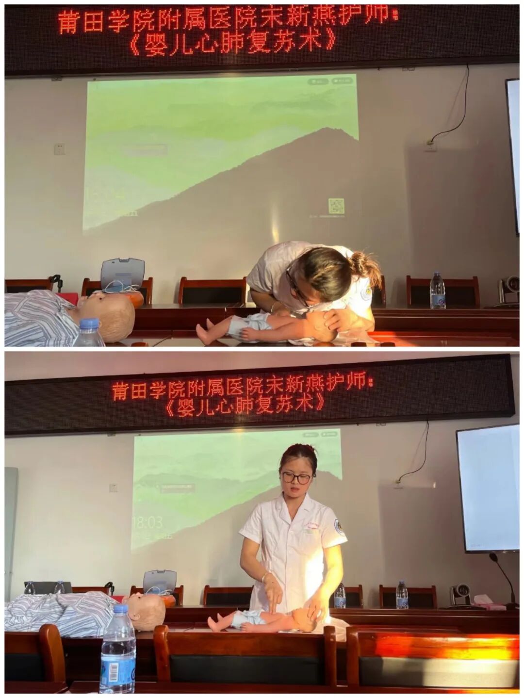 莆田学院附属医院老院区急诊科宋新燕护师为大家讲解婴儿心肺复苏的操作要点和注意事项,同时利用婴儿模型为大家进行操作演示。