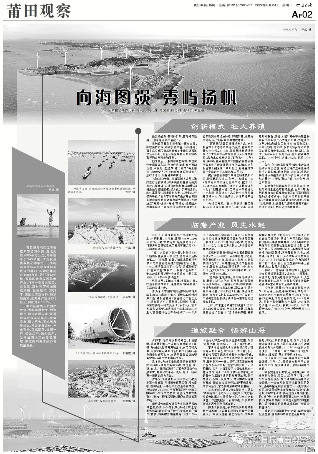 在大力发掘海洋经济潜力的同时,当地政府注重生态可持续发展。去年3月,秀屿区政府与龙源福建公司签订深海网箱养殖融合漂浮式海上风机示范项目框架协议,共建我国首个风渔融合示范项目,实现“以电养鱼、以渔养电”,形成可复制可推广的海上风电区融合环保养殖模式。