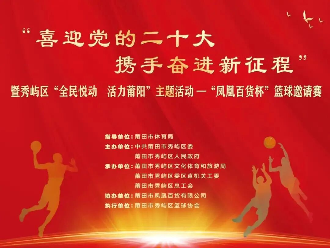 由莆田市体育局指导,中共莆田市秀屿区委、莆田市秀屿区人民政府主办,莆田市秀屿区文化体育和旅游局、中共莆田市秀屿区委区直机关工委、莆田市秀屿区总工会承办,莆田市秀屿区篮球协会协办的秀屿区“喜迎党的二十大 携手奋进新征程”暨“全民悦动 活力莆阳”主题系列活动——“凤凰百货杯”篮球邀请赛将于今晚7点正式开赛!