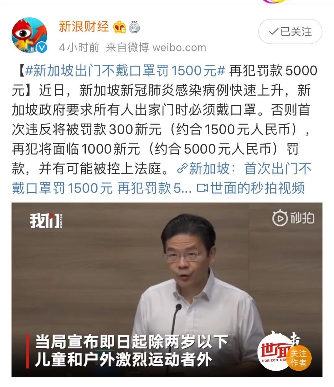 新加坡国家发展部宣布,除2岁以下幼儿和在户外进行激烈运动的人外,所有人外出时必须戴口罩。