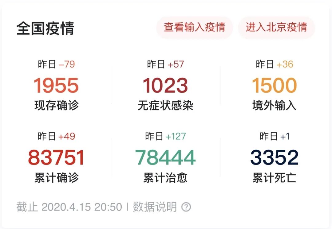 刚刚,国家卫健委首次公布全国累计报告的无症状感染者数量——6764例,其中境外输入588例,累计转归为确诊病例1297例,累计解除医学观察4444例,尚在医学观察1023例。