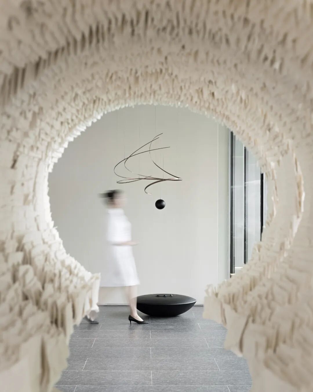 借鉴了中式古典园林中的“借景”,将整个中庭景观引入室内,将其作为空间中最大的艺术品,铺开一幅生动立体的画卷将四水归堂的东方古典园林转换成为空间中最大的艺术装置,晴时阳光自天井泻入堂前,如同“洒金”;雨时雨水从四面落入天井,恍若“流银”,寓意水聚天心、天人合一。结构环绕的空间场域和彼此相望的廊道,在动线上形成可游 可观 可居的空间关系。