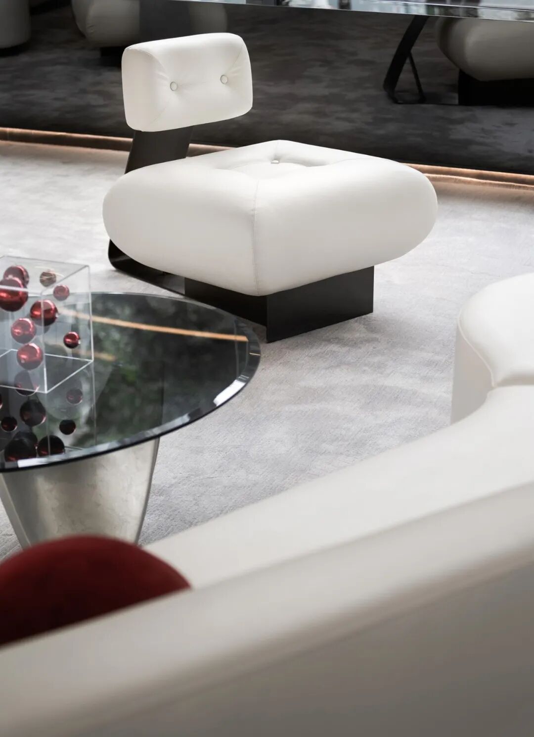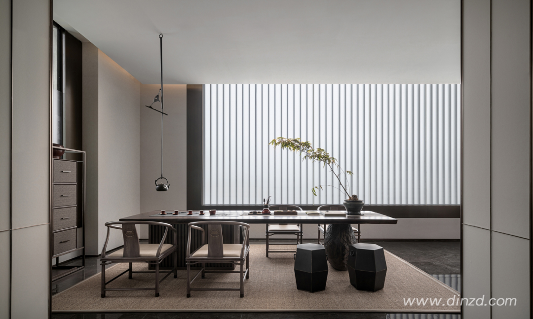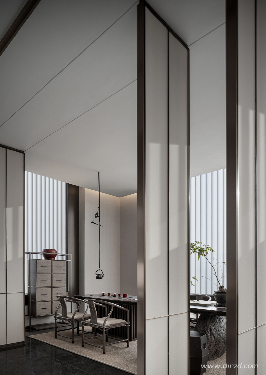 居者,礼待天下。宋式官帽椅坐立正中,仪态沉稳端庄,副椅周围环绕有序有章,彰显贵宾礼遇。主椅背景左右对称,有物有序,素雅不失高贵,为整个空间带来大气磅礴的气势。在以“空”摄“实”的朦胧里,燃一线香,沏壶好茶,架上藏纳古物雅玩,谈笑风生看沉浮,闲情逸致存高远,何其自在。
