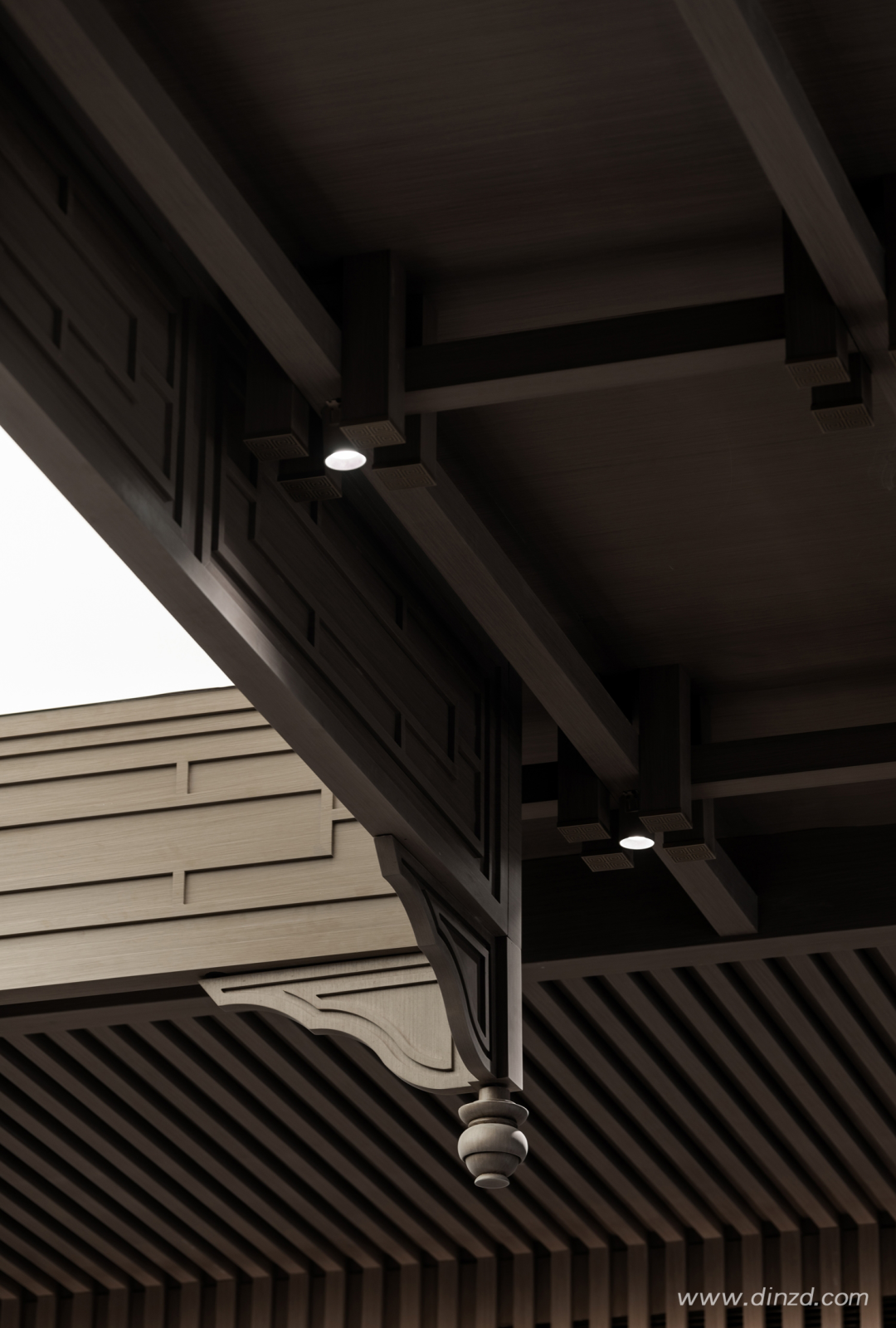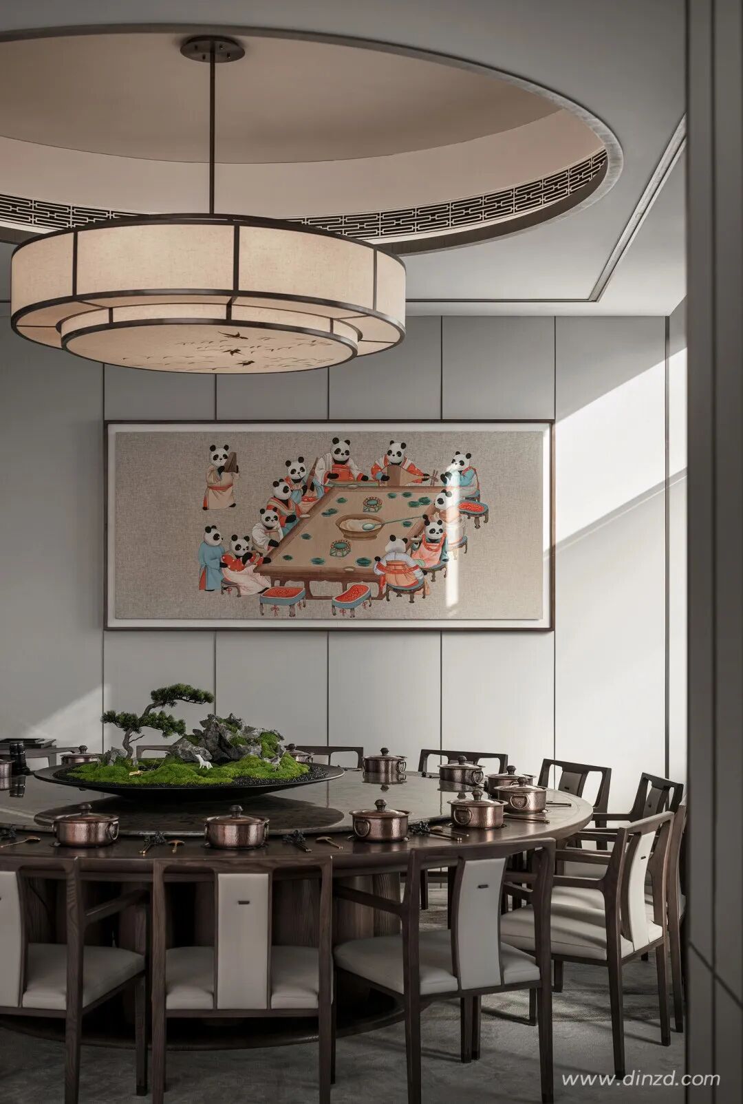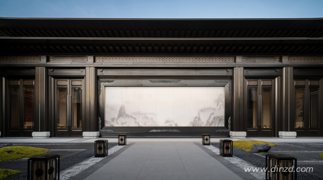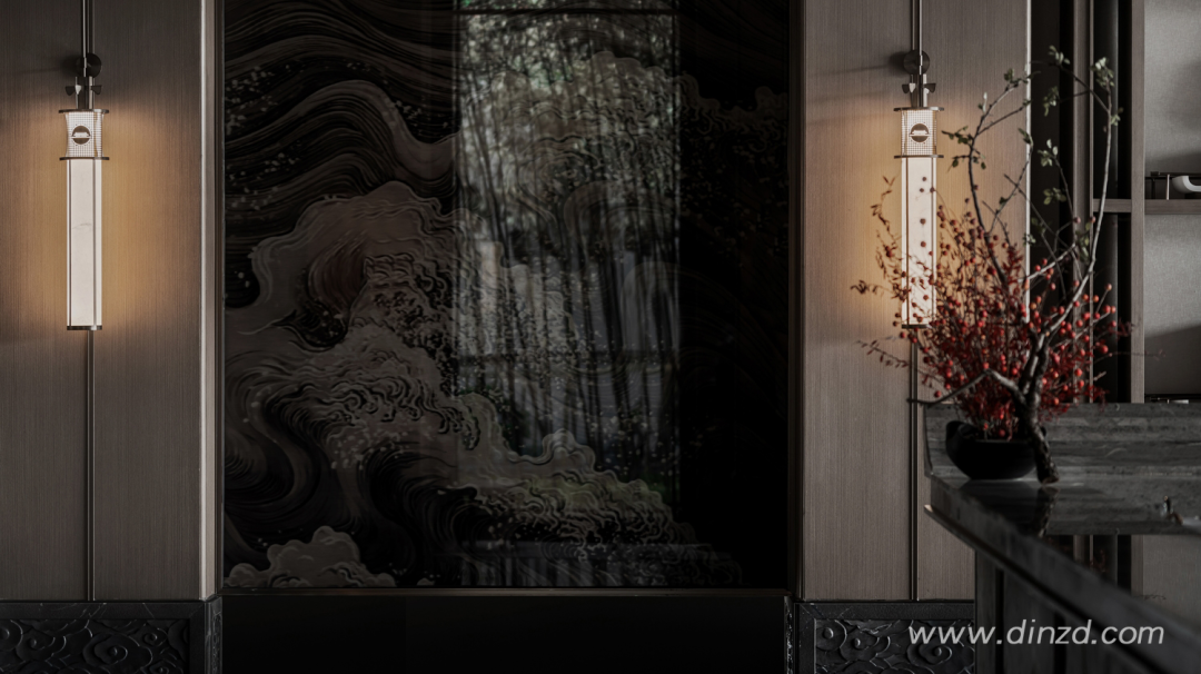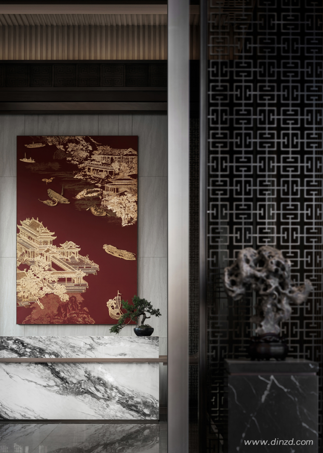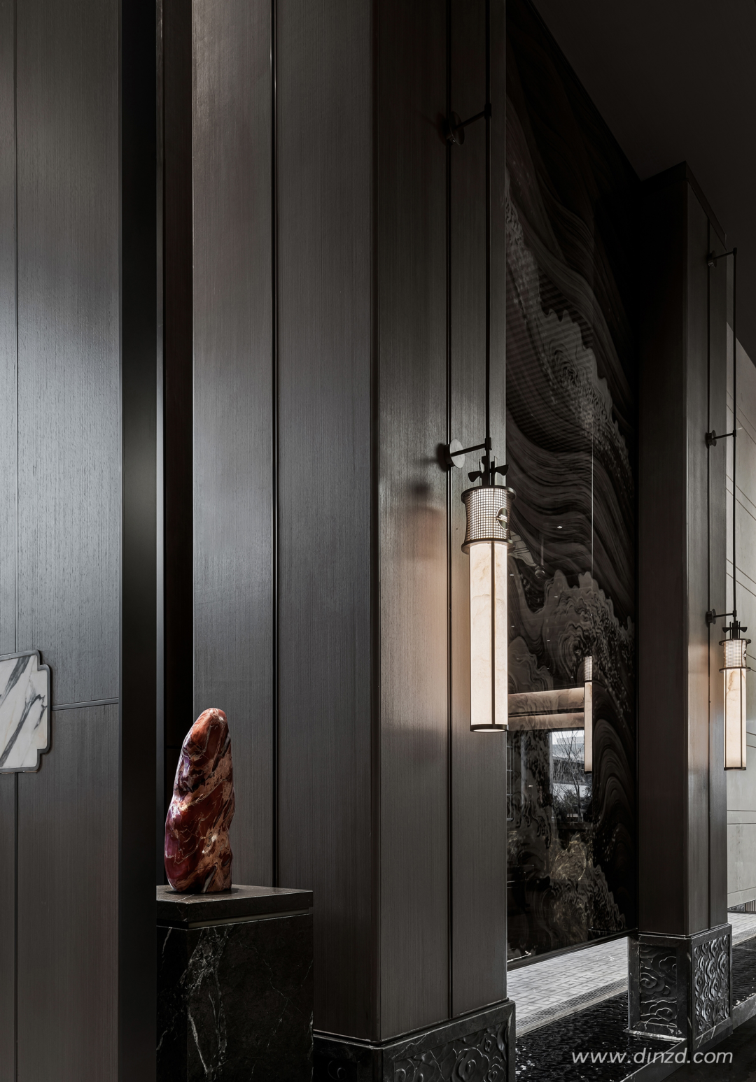 夜半深廊人语定,一枝松动鹤来声。宾客因宴始而来,穿过门厅,便是夜宴的长廊。奇石蜿蜒伸展,神秘自然,万物归林,闲然自在。给穿过中式园林景观之人以清新而“超然物外”之感。
