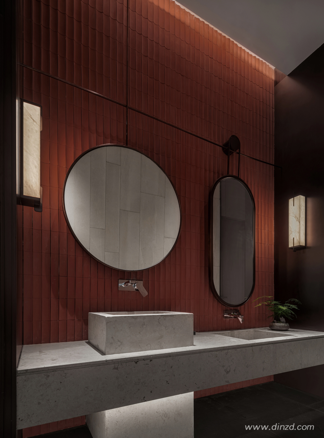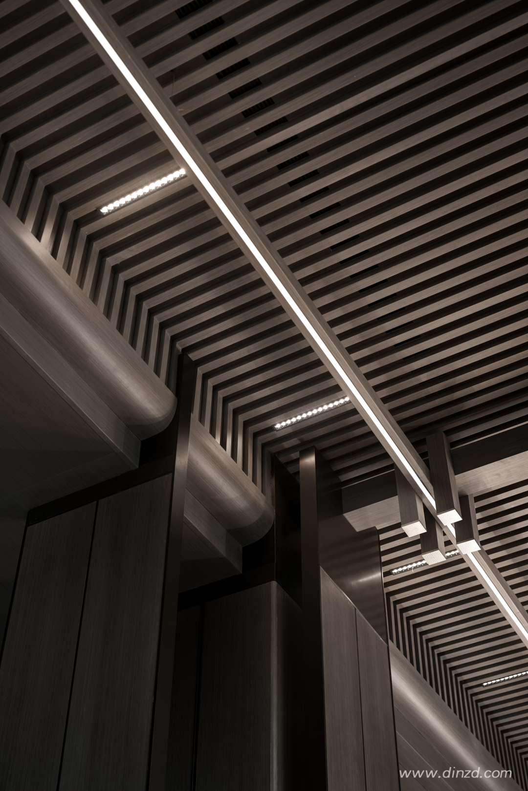 空间叙事虚实有度,木质、石材、金属等交叠材质与厚重的建筑体量为”实”,隔断则成为界定空间朦胧的”虚幻”表达。摆放着的是丹阳出土的商周时期青铜器物原版仿制品,隔断中层耸立的器皿在似是而非的迷离中定格历史浓墨重彩的一瞬。