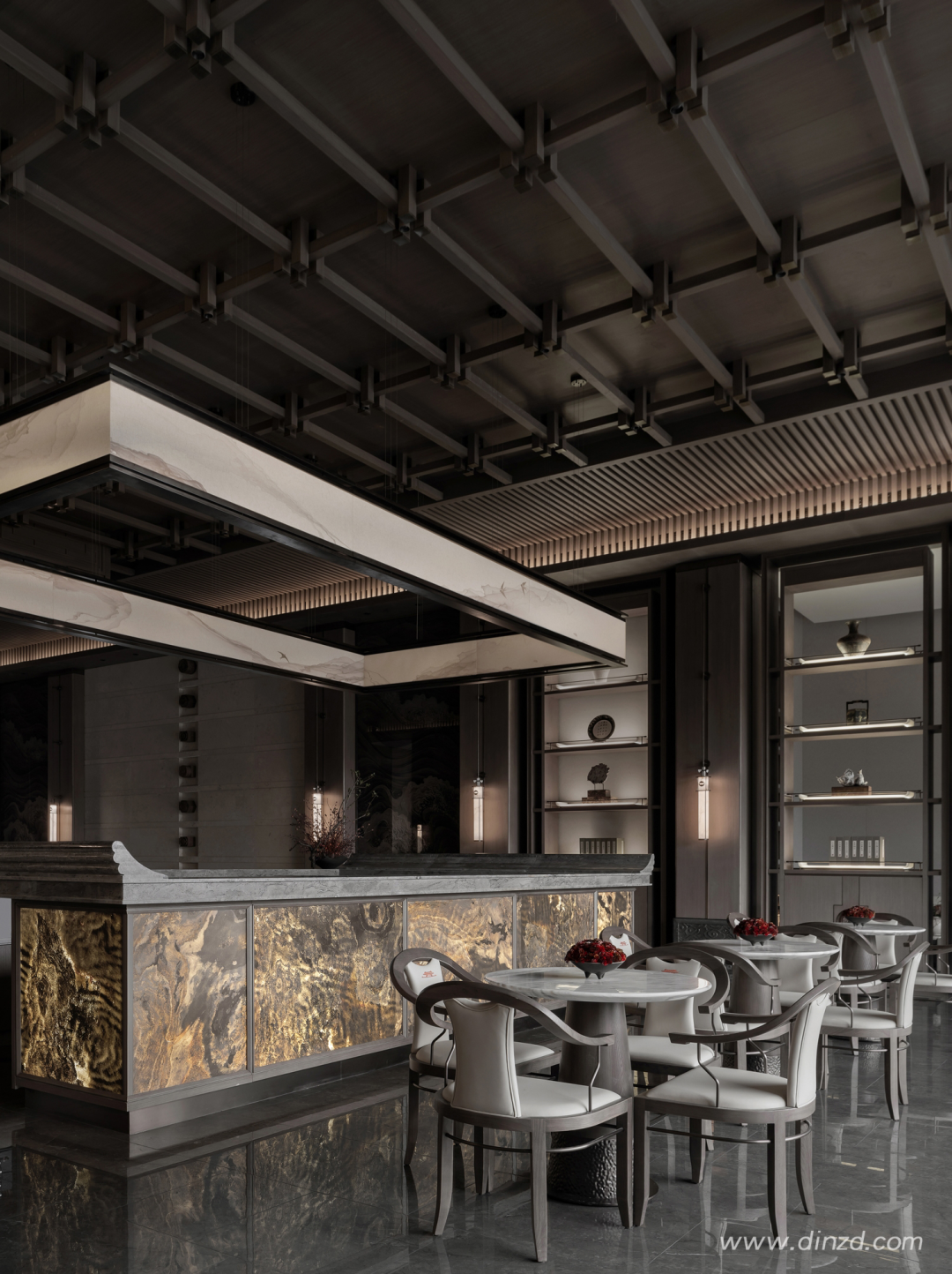 以大雁盘旋飞翔的姿态和雁群在天空划过的壮阔弧线,提取元素在水吧台的装置吊灯上,以雁鸣、雁群、雁姿迎宾客,展现唐壮丽之风采。