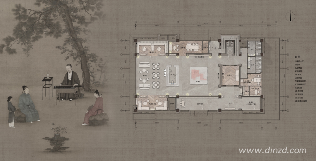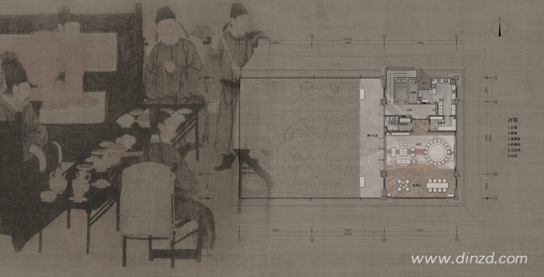 走廊墙壁处悬挂着的《听琴图》刻画的不仅仅是固定的人、物、象,还隐喻着古老中国千年的生活艺术:既看的到别人的光芒,也信仰着自己的力量。