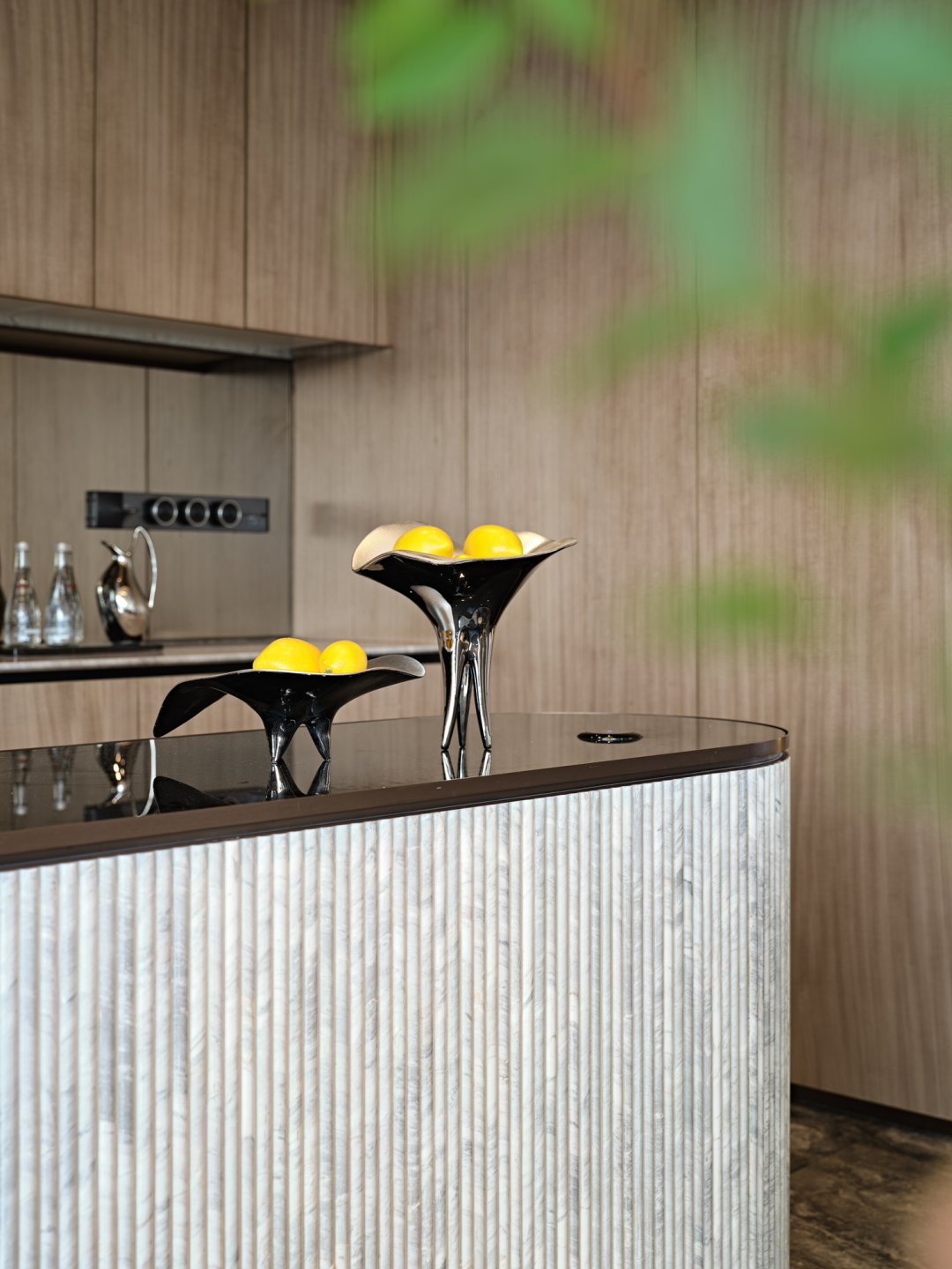 客餐厅空间的通透与包容性也正符合当下的餐厅社交属性,开放的厨房搭配岛台,圆弧形的餐桌适时加入,令原本繁杂的功能性空间干练而精致,流畅的线条呼应着客厅的沙发茶几。