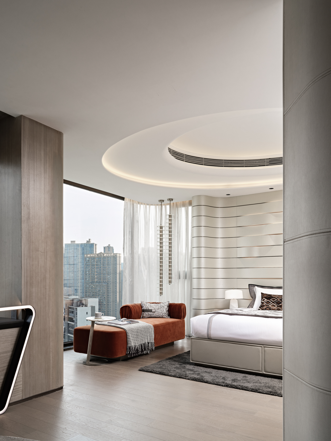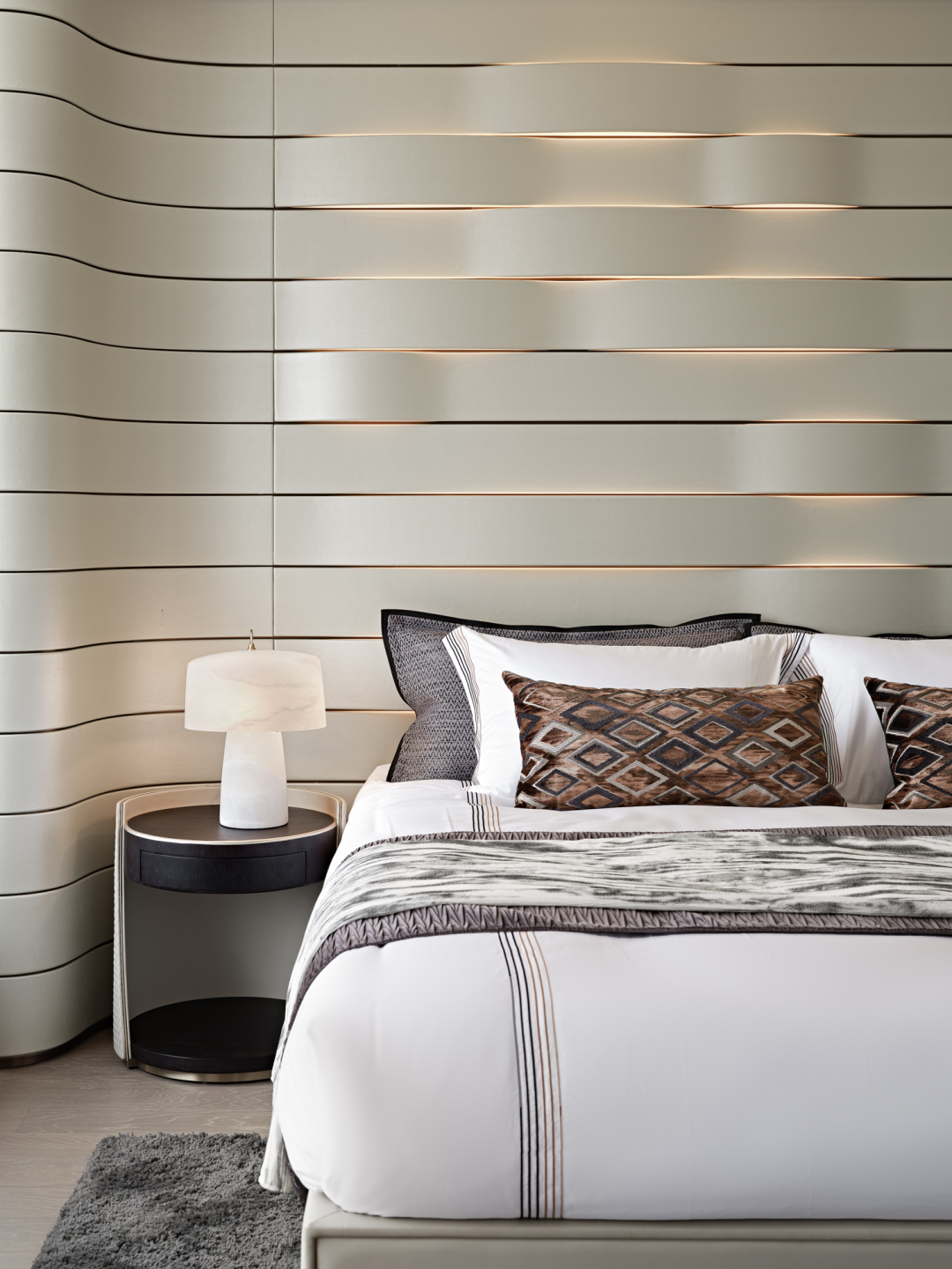 空间通过弧形切割,主卧背景板亦以流动的线条呼应落地窗的线条,暗藏在浮动的皮革板背后的灯带,也赋予了材质的层次。