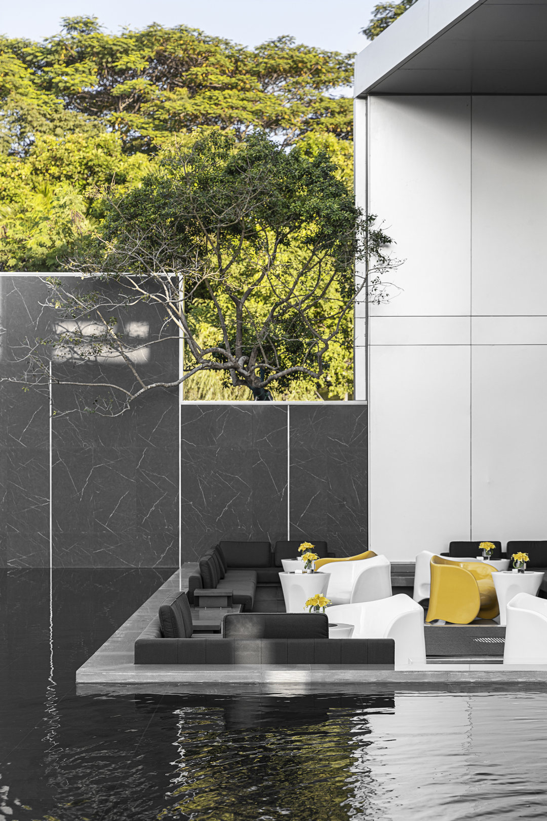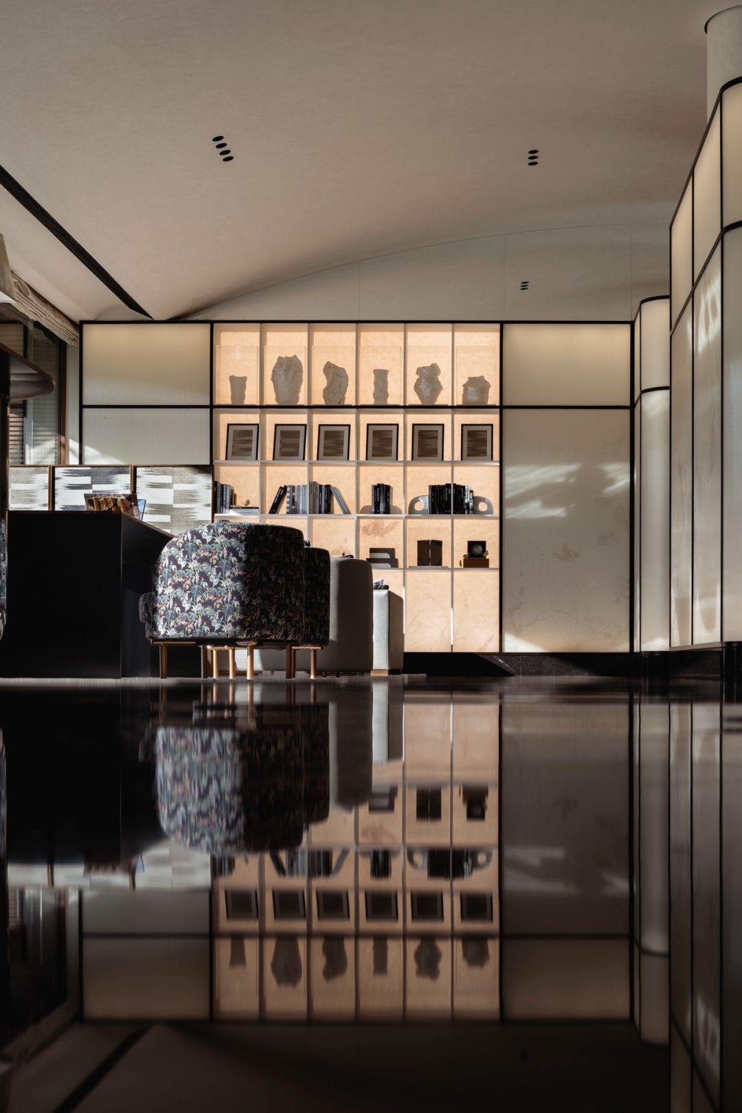古浮桥以舟为桥,行走间,略感摇晃,颇有乐生。深色砂砾铺就,苔藓假山石点缀,营造出浅滩、礁石、孤岛的氛围,以深色大理石为桥,一步一景,步履稳重却心生摇曳。
