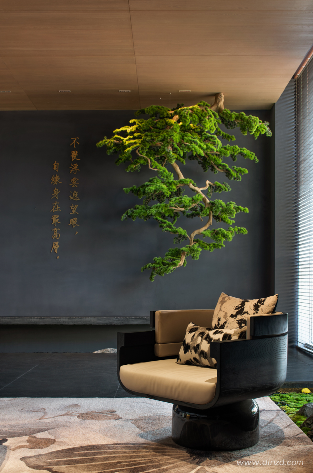 深蓝色的背景墙,破浪者谓之海,万里长河入胸怀;登高者谓之天,青翠苍松天外来。极具设计感的转角沙发、单人沙发、茶几彰显不凡品质,营造尊崇的私密空间。
