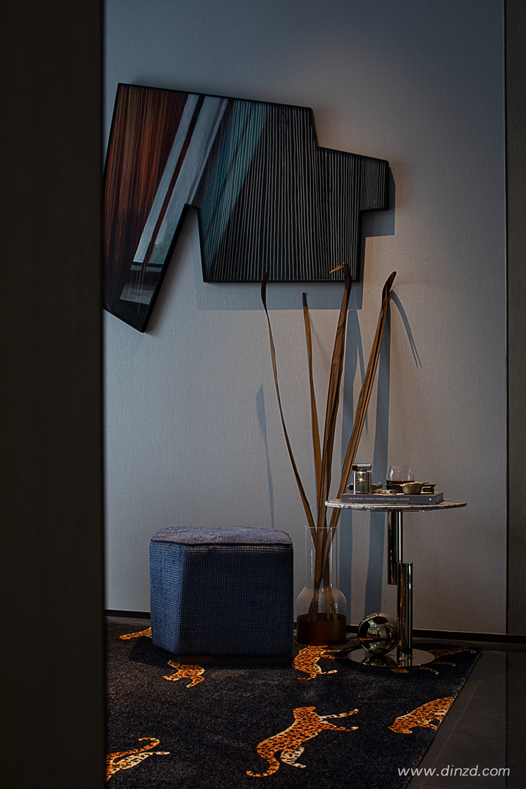 色彩回归自然的拙朴,以灰色和木色做基底,空间氛围轻松自然。书画则是由心而生的意趣,常看常新。
