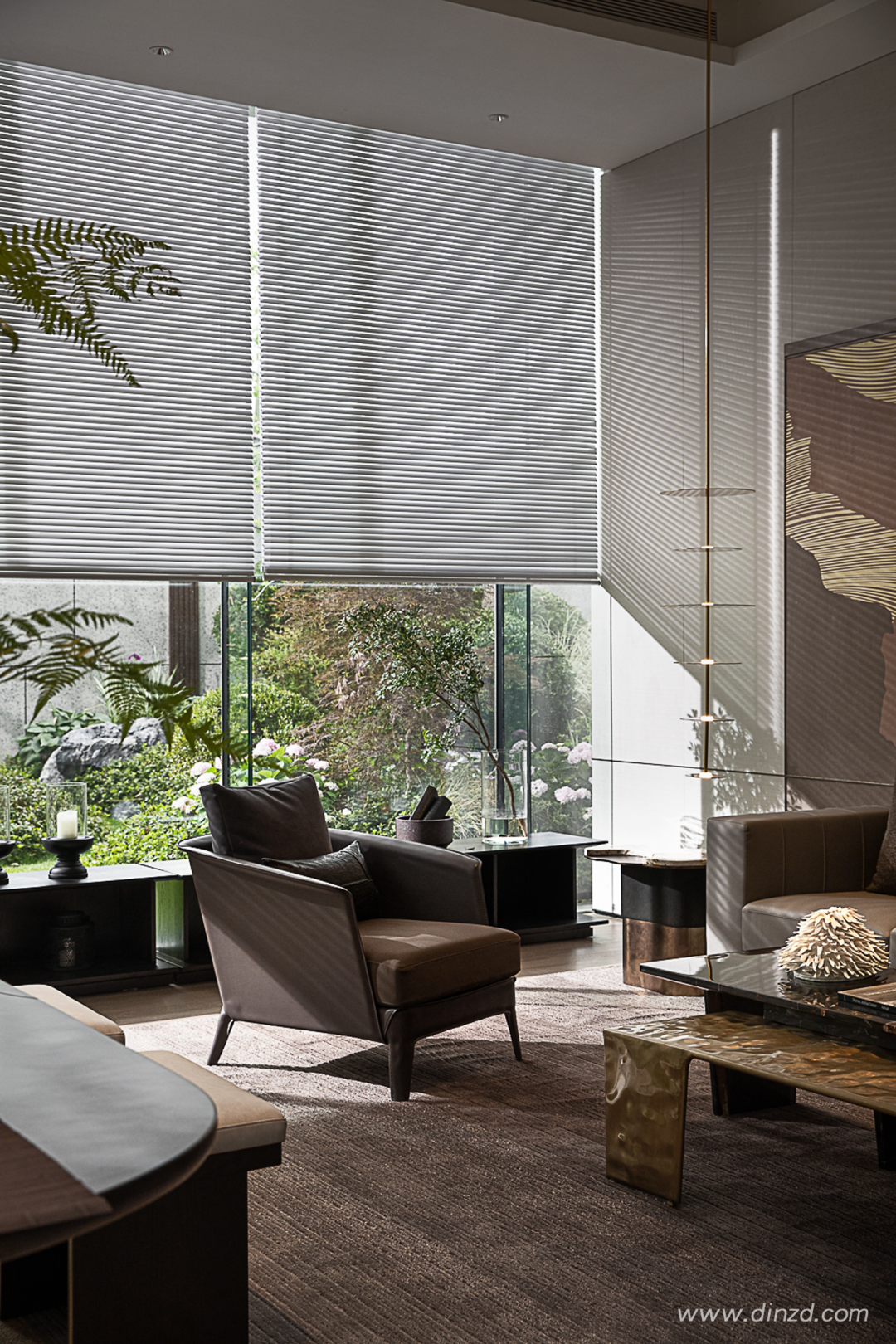 取自园林的框景之意,洽谈区使用艺术玻璃隔断形成私密空间,由浅至深地渗透诗意。宽幅落地窗最大限度地将光线引入室内,让自然与室内发生不加干预的互动。
