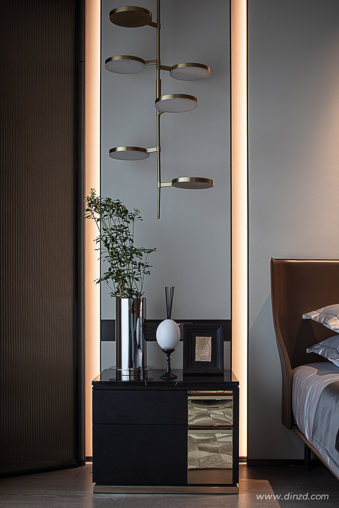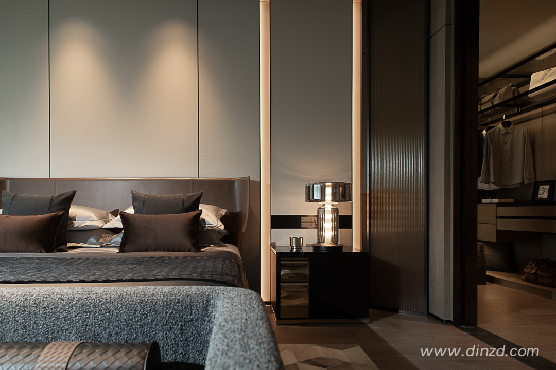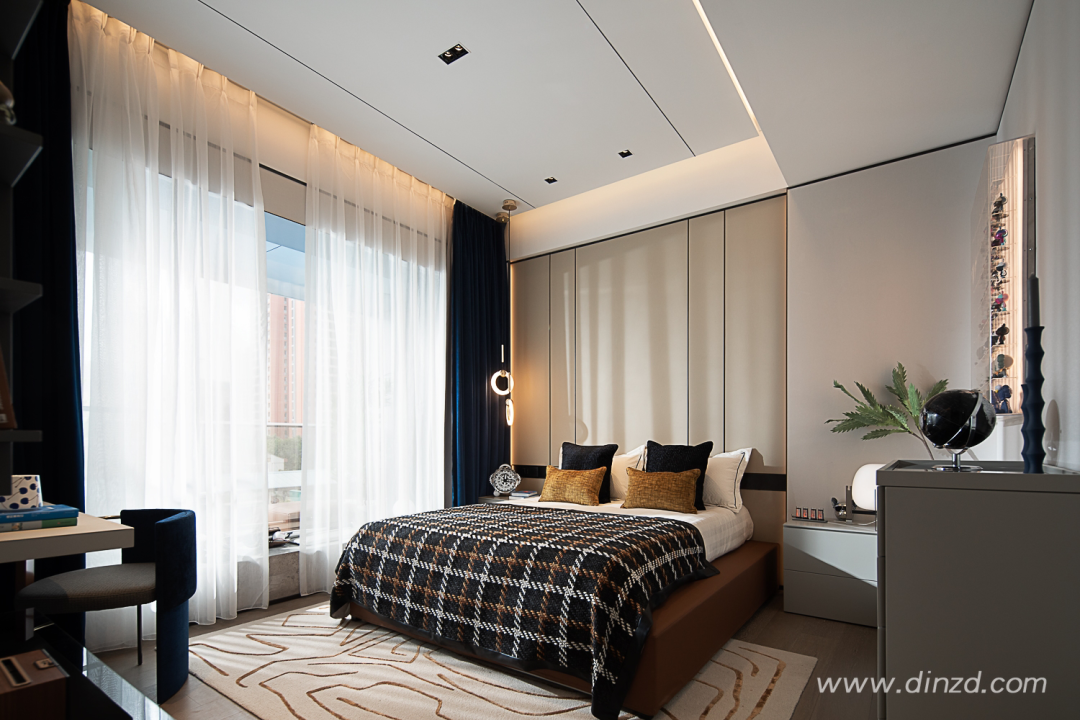 主卧同样采用全景落地窗,通透的快意、沉稳克制的艺术感、材质的奢适,无比自然的相遇。阳光透过窗纱,细腻均匀、明暗有序的剪影铺设在室内物品表面,依稀可见关中风耀万邦的盛貌。