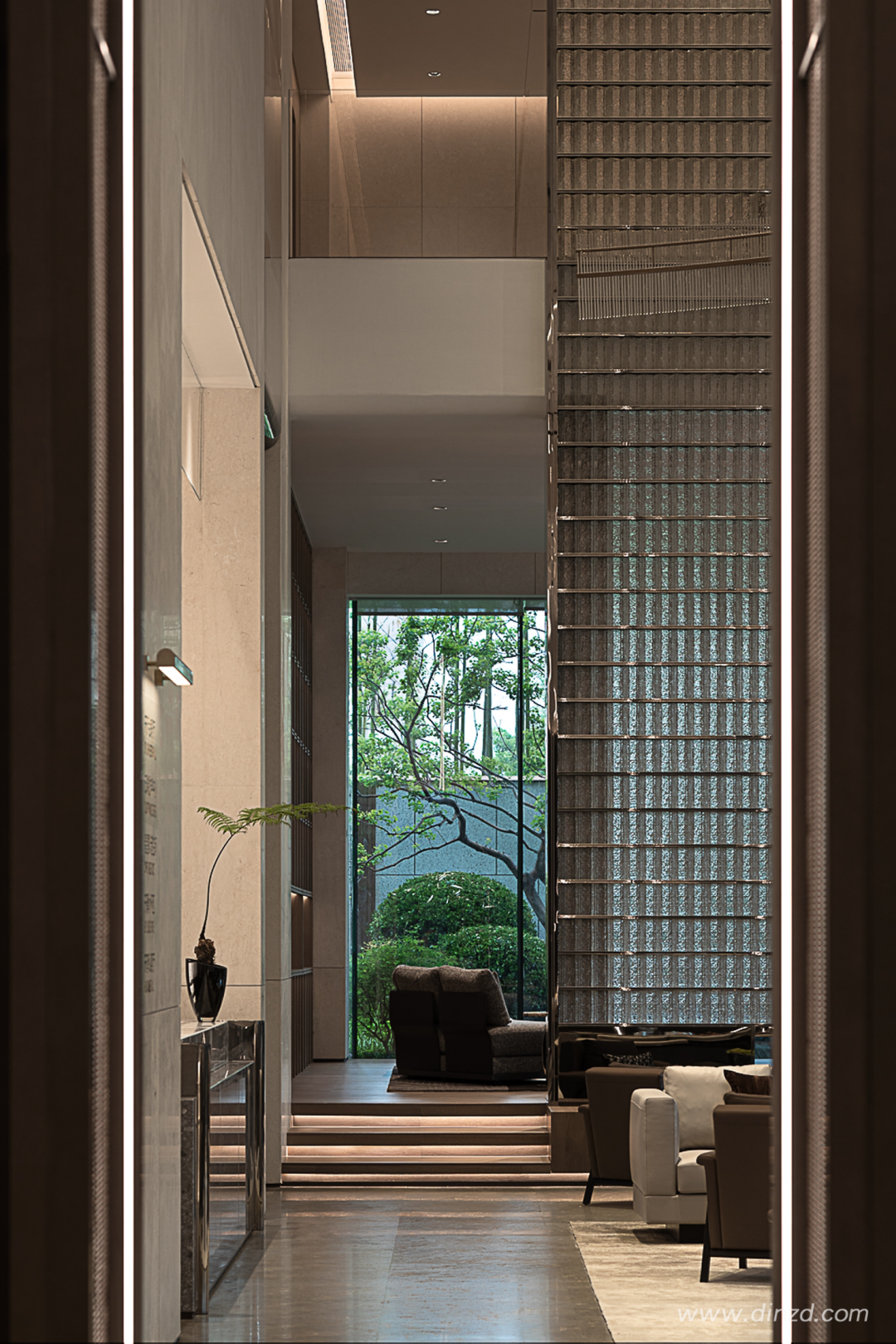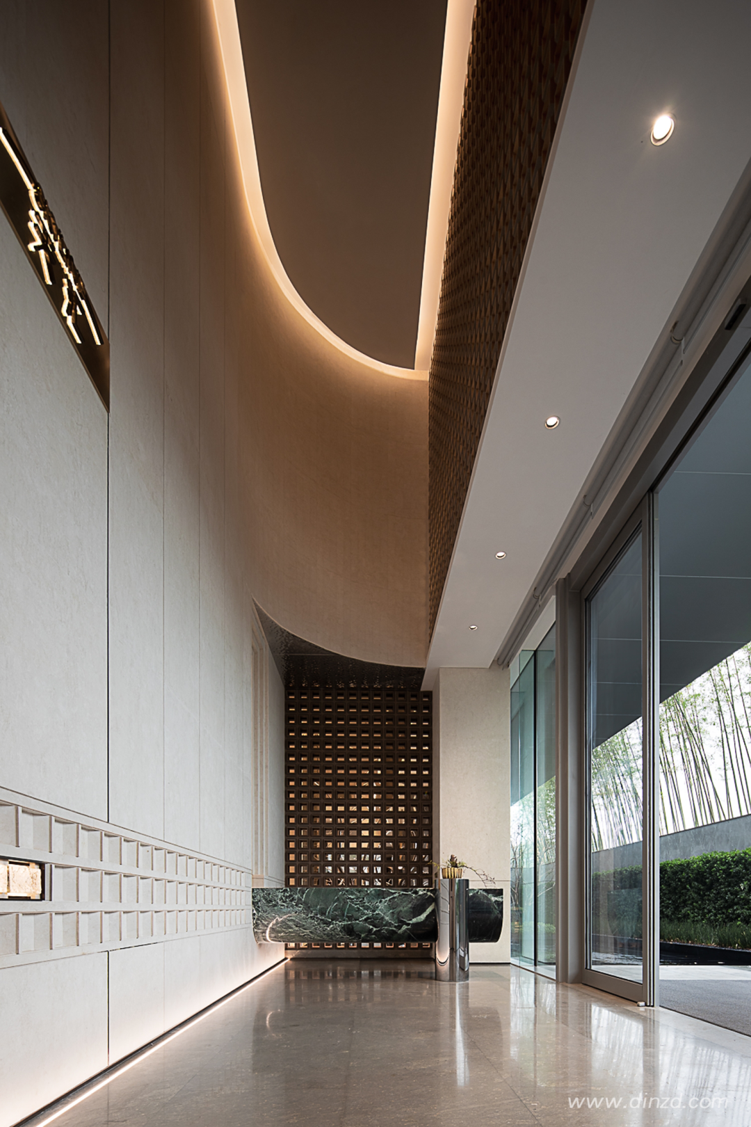 灵感是在静谧与光明的交汇处对最初的感知,循着光影律动探寻城市的变迁脉络。入口处气势恢宏,软装延续建筑体块的流动性,雕塑和艺术花艺静置于此。