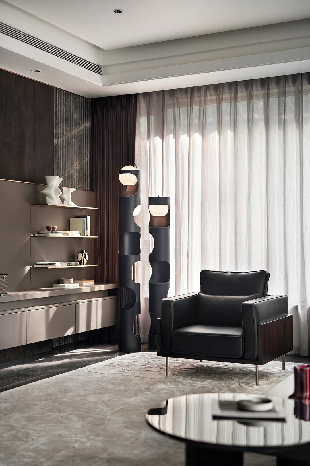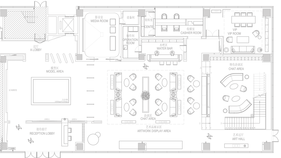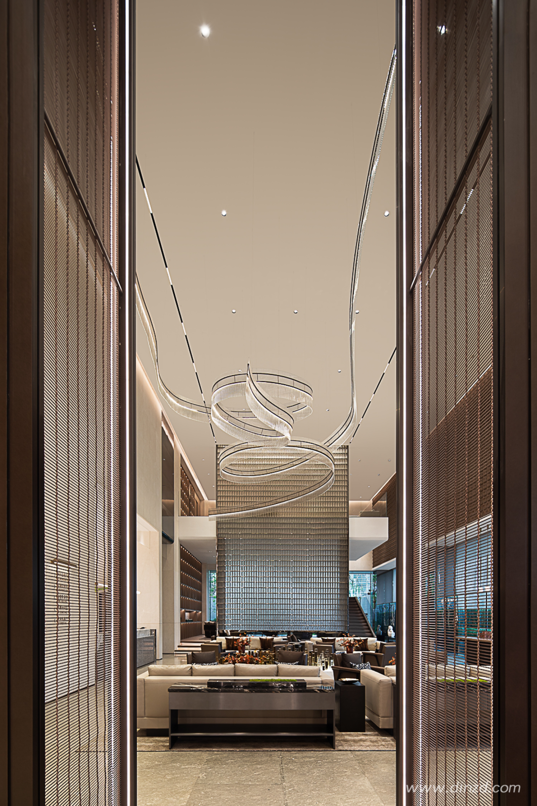 基于原有动线,洽谈区软装通过并置及阵列式布局提供符合建筑逻辑的强烈秩序性,疏朗对比间让空间产生自如的呼吸感。流动的灯饰如河流蜿蜒的曲线韵律,刚柔并济、似梦如幻,在地化元素被赋予了艺术感知。