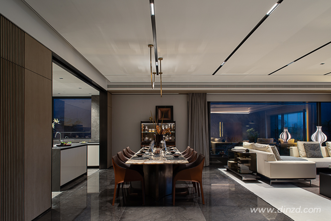 餐厨与客厅不设明显区隔,将空间尺度放大到极致,花艺、酒柜、大理石餐桌彼此映射,消弭不同功能区域的疏离感。