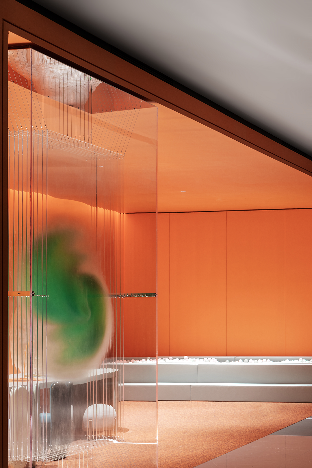 光线经过过滤与折射,缓缓渗入到场内,空间渗透于此形成自然演绎,那些照进沙盘内的光影,仿佛晴日里森林中的树影斑驳,郁郁葱葱的生命力由此延伸开来。