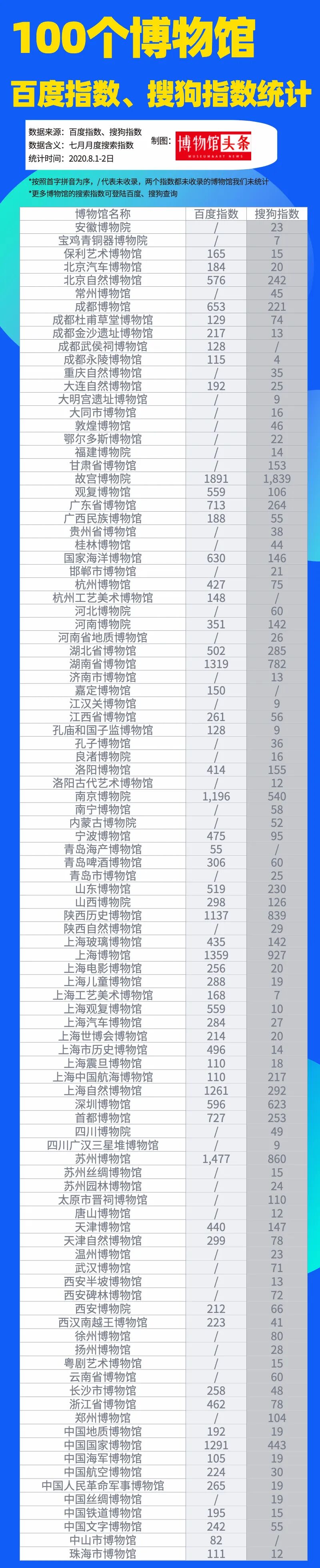 今日头条,我们将发布全国“十大热搜博物馆”“十大热搜展览”“十大热搜自然类博物馆”“十大热搜革命类博物馆纪念馆”和“北京十大热搜博物馆”“上海十大热搜博物馆”“上海十大热搜美术馆”“江苏十大热搜博物馆”“浙江十大热搜博物馆”“广东十大热搜博物馆”等20余个榜单,敬请期待!