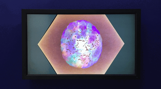 艺术家王海洋经历了一场腿部手术,而康复过程中的身体经验和思考历程,你都可以在这场展览中看到。在《触不可及》系列作品中,因为手术初愈,他无法长时间站立,只能将画笔平放,依靠伸长手臂作画,而臂展无法触及的画布中心区域形成一个光点被保留下来,如同能够吞噬一切的孔洞;影像作品《镜子》,艺术家收集了45个人的唾液,作为颜料的稀释剂进行作画,分别绘制成45张近似人脑的形态,以此来完成对个体与他人的隐喻和模拟;多频影像装置《蹂躏》中,《连动机制》以人咀嚼口香糖的动作来模拟观点和思想的产生过程,通过对原始图像的镜像处理,使拍摄对象的嘴巴在影像中完全消失,由此关闭了有关表达的一切出口。