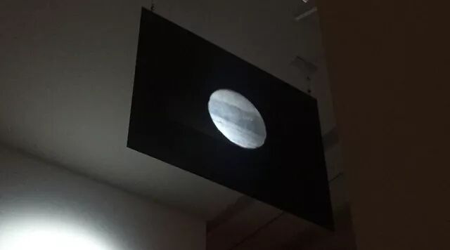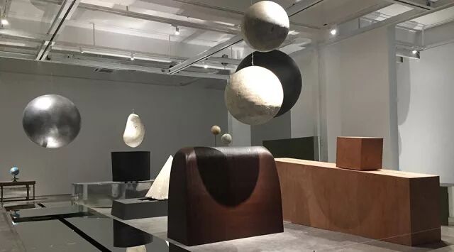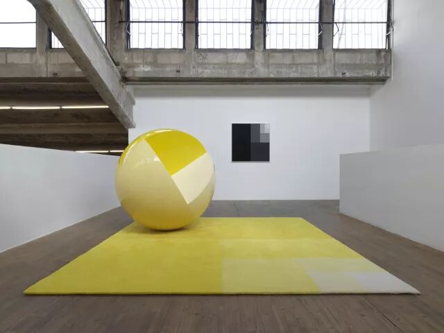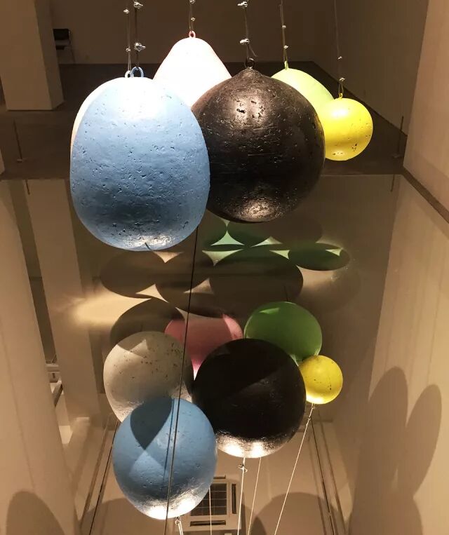 穿过这组仿若迷宫般的作品即是刘韡新作《周期》,以水泥浇筑的巨型球体和带着城市肌理的拼装物件在各自的轨道上运行,如同一个人为制造的小宇宙;旁边的作品《气流》同样是用水泥浇筑出巨大球体,透过镜面却可以看到一束轻盈飞起的气球。