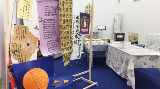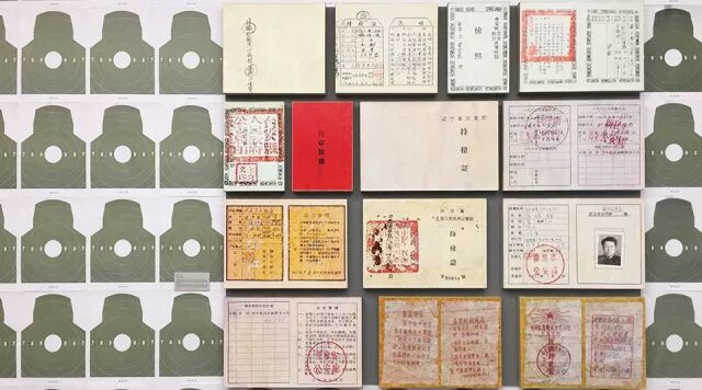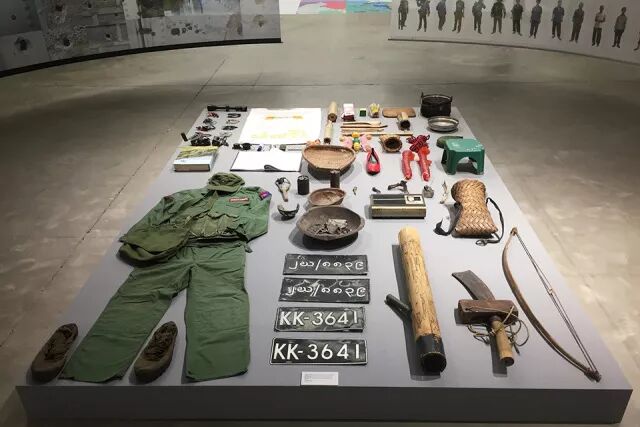 为了创作以枪支为主题的项目“开火”,他采访了各种人物,搜集了不同年代的持枪证,通过自身体验设计了一套夺枪术。而关于缅甸的一系列作品则是因为2015年在新闻中看到有关果敢的报道。“我们到难民营的第一天就被敲诈了,只好在当地买了刀和枪防身”。绿色帐篷里挂着他根据难民营见闻画的小画。他在那里遇见过烟农、茶农、毒贩、赌场老板……收集当地人使用的蜡烛、缅军军服甚至吸毒用具,带回来呈现在展览里。