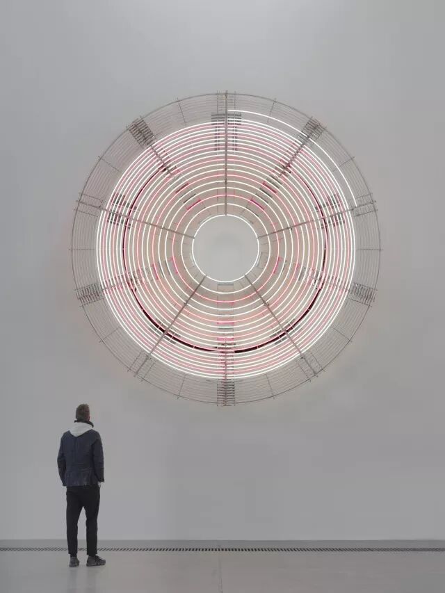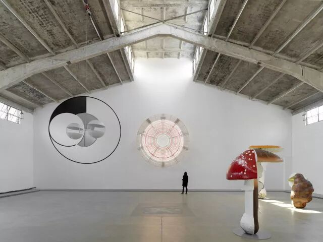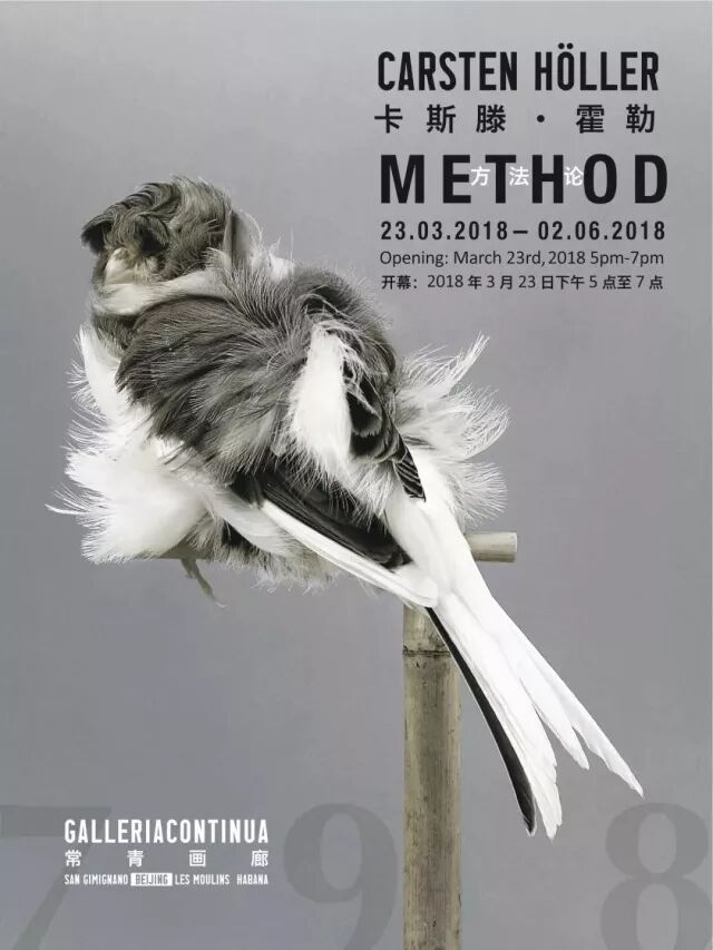 卡斯滕·霍勒曾攻读自然科学,并钟情于分割法则。此次展出新作《分割圆金丝雀移动装置(外黑内白)》,在球形笼里两只金丝雀绕着一个中轴打转,暗示着生命自身沿着无尽的“分割法则”进行——既将事物分离又使它们连结。作品《十进制时钟(白色与粉色)》,运转的时钟以十进制——10小时、100分钟与100秒为刻度,关注时间的分割。你也可以走进现场的《三重巨型蘑菇》丛林,蘑菇被刻意放大,每一株都由不同种类的蘑菇拼接而成。在二层的封闭空间中,你还可以看一场《点数电影》,24个白色小圆点在黑色画面中起舞,再一个个消失,不妨发挥自己的想象和认知,填补对作品的理解,以此重新审视自身感官的基础和界限。