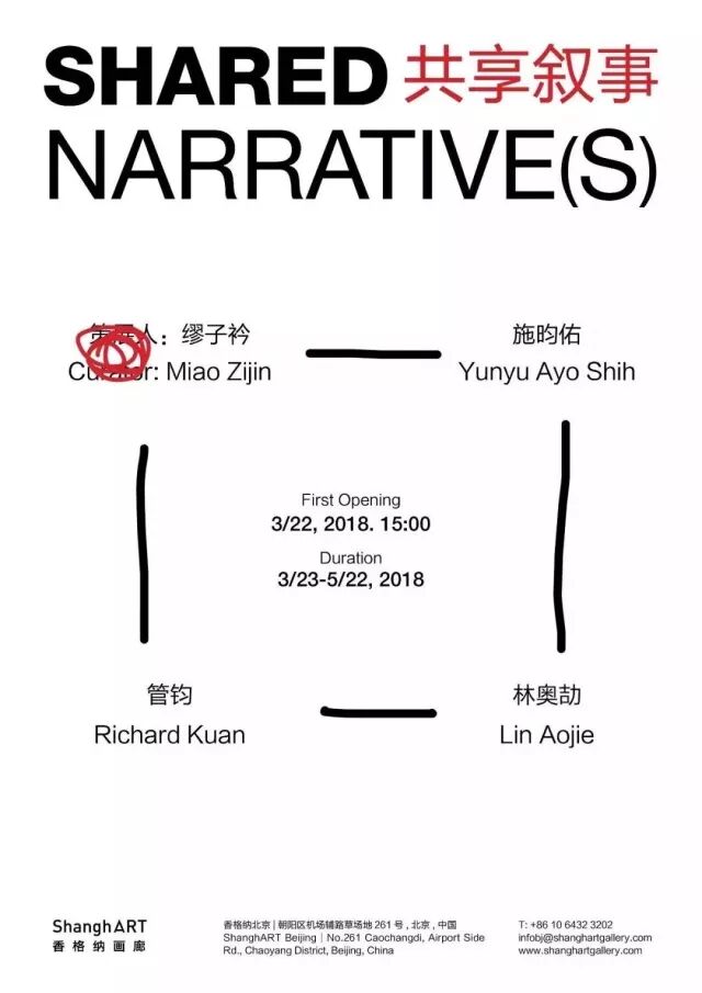 走进《共享叙事》的空间,你要仔细搜寻线索。每位艺术家的创作都会包含或伴随下一位艺术家的作品,让开放的对话、即兴与不确定性发生:施昀佑把空间内部以及延伸至外部的暖气管盖掀开,并将地下的金属暖气管清洗抛光,还留下了2件玩具喷泉;管钧则在室内安装了摄像机和微型LED屏幕,拍摄和播放这个过程;林奥劼将八本包含自己用电脑软件绘制叙事图像的艺术家书散放于书架上,与香格纳艺术家的画册并置。