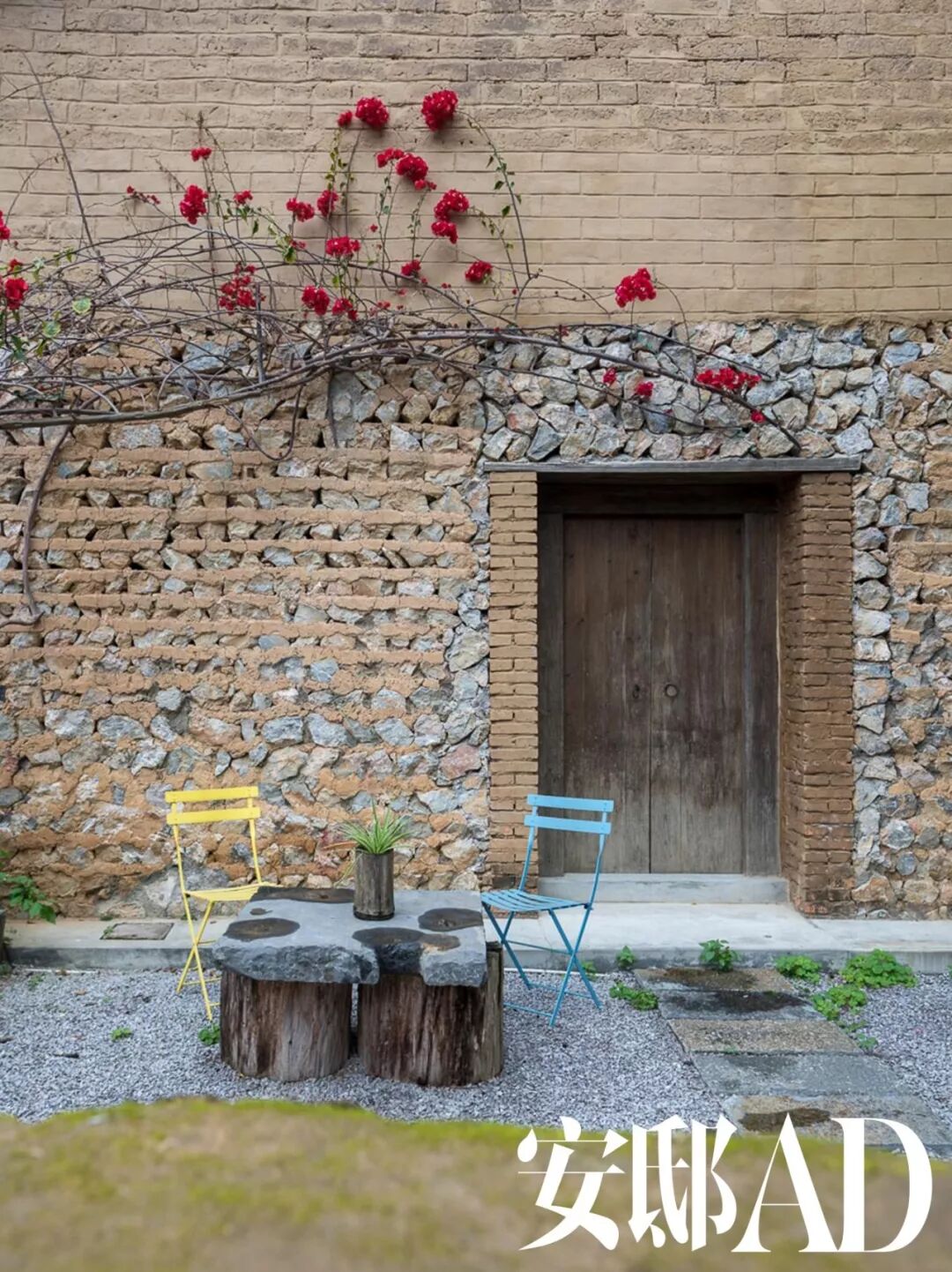从门口的村道步入云庐也不过是脚底从土路到碎石小道的触感变化,十几幢体量不一的黄泥土坯房星罗棋布于眼前,每幢都带着不规则的小院。院墙低低的,用当地毛石垒起来,沃若的植物爬过院墙探出头来,真有种“鸡犬之声相闻”的亲切。正是广西的雨季,淅淅沥沥的雨水润湿了土坯墙面,让它呈现出橘黄的色泽,青石板路也打湿了,有了明暗变化,但没有高光,一切都安静顺和极了,从视觉到触觉都是柔暖的。