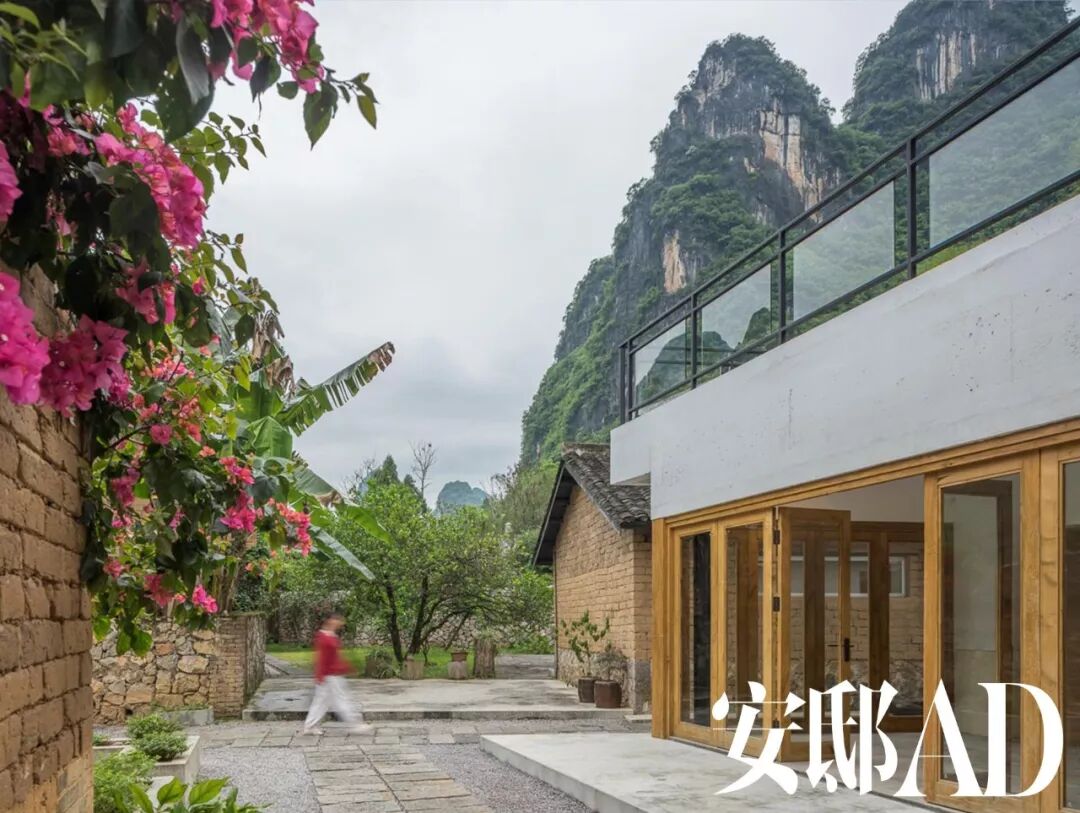 从阳朔高铁站下来,还要车行近1小时。伴着一路云遮雾绕的黛青风景,我们终于在邻近20元人民币上的背景地元宝山的村落里找到了“喜岳·云庐”的入口。其实说“找到”也不准确,说“入口”也难以分辨,这片不算大的区域与周遭起伏缥缈的漓江山水和略显萧条的自然村落似乎已经长在了一起,很难划清明显的边界。