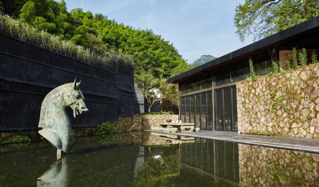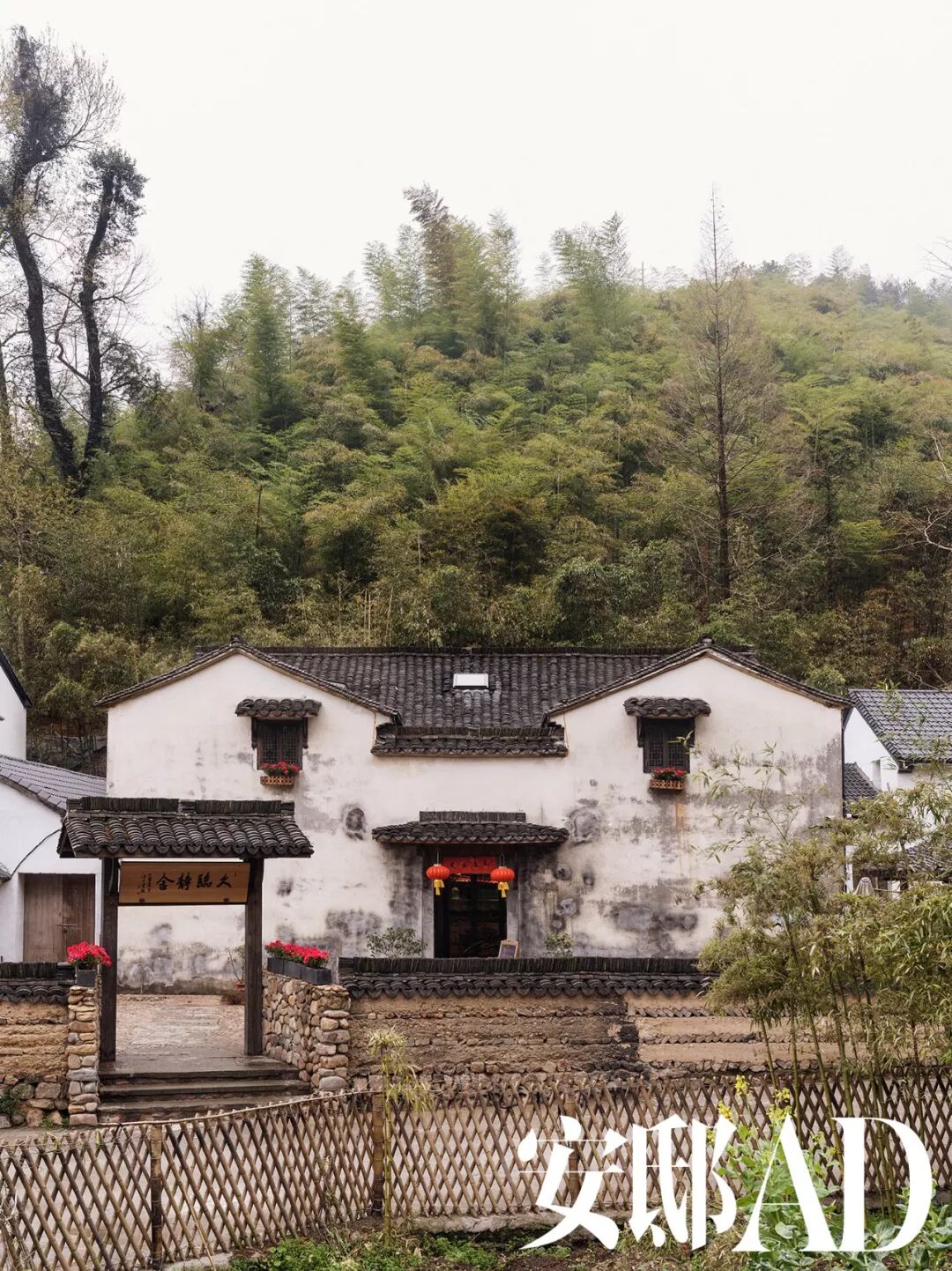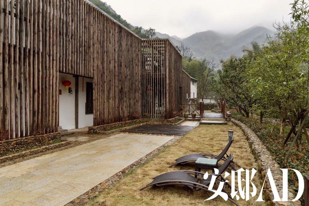 白墙黛瓦的两层民宅依山傍水而立——“开门见山,开窗临湖’。据民宿的负责人讲,这座宅院建造于中华人民共和国成立前,当时是一个大户人家的宅邸,所以从格局观之仍有寄情山水的雅致。负责民宿改造的设计师很好地保留了建筑原始拙朴的风格,从前充满烟火气的灶台摇身一变,成了如今别具一格的前台展示,屋内的墙体被挖空做成园林样式。院落以天井为中心围合而成、一层的3面墙体均被替换为采光良好的玻璃门,赋予昏暗的老宅以清亮的现代视觉。梅雨天大概是最有江南特色的时间段。当不期而至的大雨留客在江南山村时,看着雨水从四面屋顶倾泻而下落入天井,似乎也在此刻体会到古人所说“四水归堂”的美好寓意。