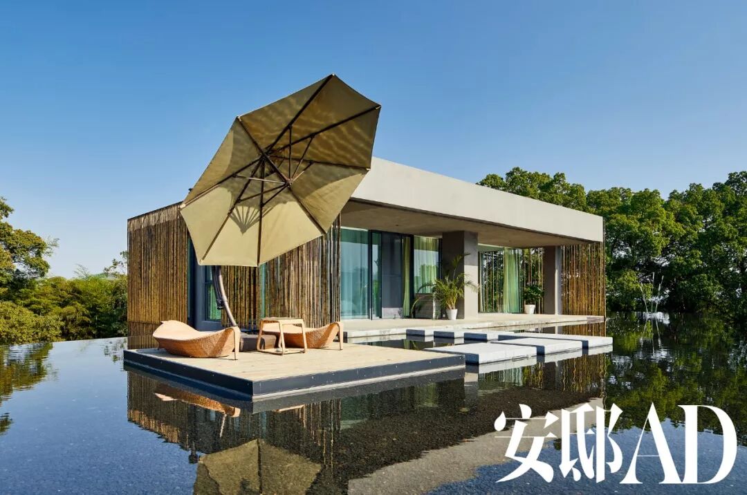 项目基地周边自然景观丰富、别致:西面有葱绿且肌理独特的白茶坡,北面有连绵叠嶂的远山,东面有茂密深幽随风摇曳的竹林。但八荒设计注意到,基地周边缺少了“水”的元素。水,尤其是一池平静的水面,能让人瞬间心情静怡。建筑的三层楼均有无边亲水台:一楼的泳池、二楼南面阳台的无边水景、三楼整层屋面的无边水景,每一层都有独特的景致,一层比一层更令人意外。每个房间都根据周边自然环境的朝向设置,结合水,创造每个房间独一无二的自然故事。