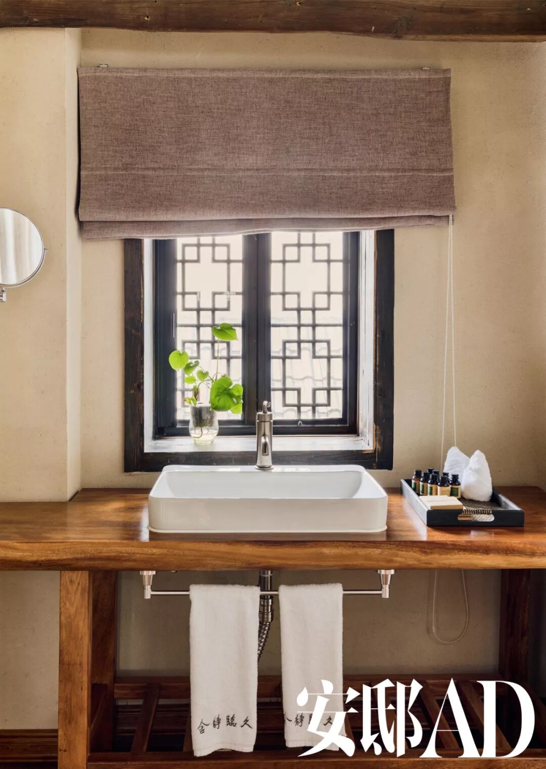 他首先确定的方针就是“能留下的尽量都保留”,譬如建筑结构、院落形式和土坯房的样式。他找来会做传统土坯砖的师傅,做出新砖,对原本已经损坏的墙面进行加固、补换。室内部分则在上、下两层的左右各设置一间客房,原来堂屋的位置则被改造为共用的聚会空间。客房内部依然保持着旧有的小尺度,但室内装饰极尽清简雅洁,削弱视觉上的刺激而增加嵌入式的隐性空间,人在其中,颇觉馨然自在。“这些都是看得到的部分,但功夫更多用在了看不到的部分。”刘宇扬说的便是落架大修之后的土坯墙体之内,其实还做了一个5厘米厚的白水泥“内胆”,所以人能接触到的内部是光洁的,能看到的外部则是质朴的,而这两者之间的部分正好藏下各种管线。“现在你能看到这些土坯砖好像大小、厚薄不一,其实它正反映了农家手作的那种随机性,是生活中自然生长出来的艺术品。至于这些土坯砖之间的新旧关系,我就让它保留在那里,随着时间的蔓延,它们会自然融合。”