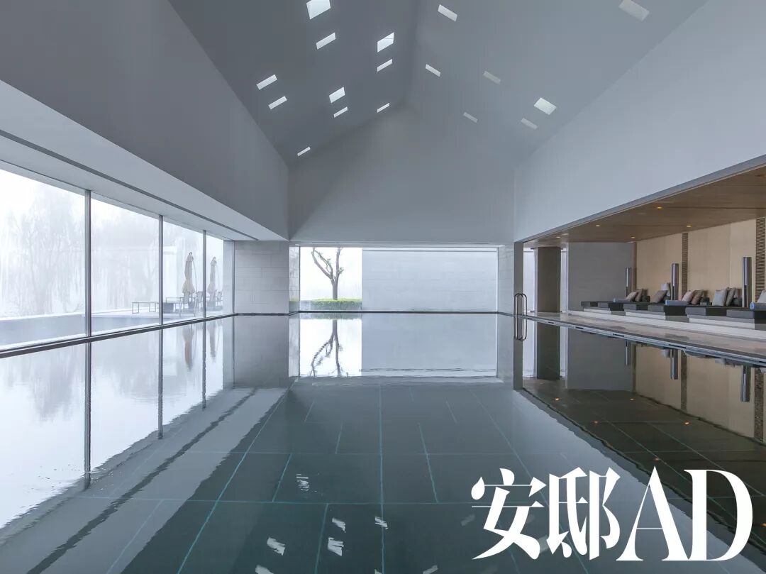 ▲室内泳池效仿了西班牙阿尔罕布拉宫著名的星夜浴室的设计,坡屋顶上不规则的开窗漏入星星点点的光线,让你如同在银河中徜徉。