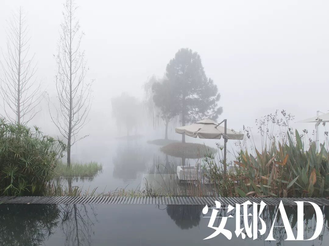 ▲全日制餐厅水市口直面一个野生湿地公园。在清晨大雾里,湿地公园里的水浅浅没住了户外座位的沙发腿,仙气十足。