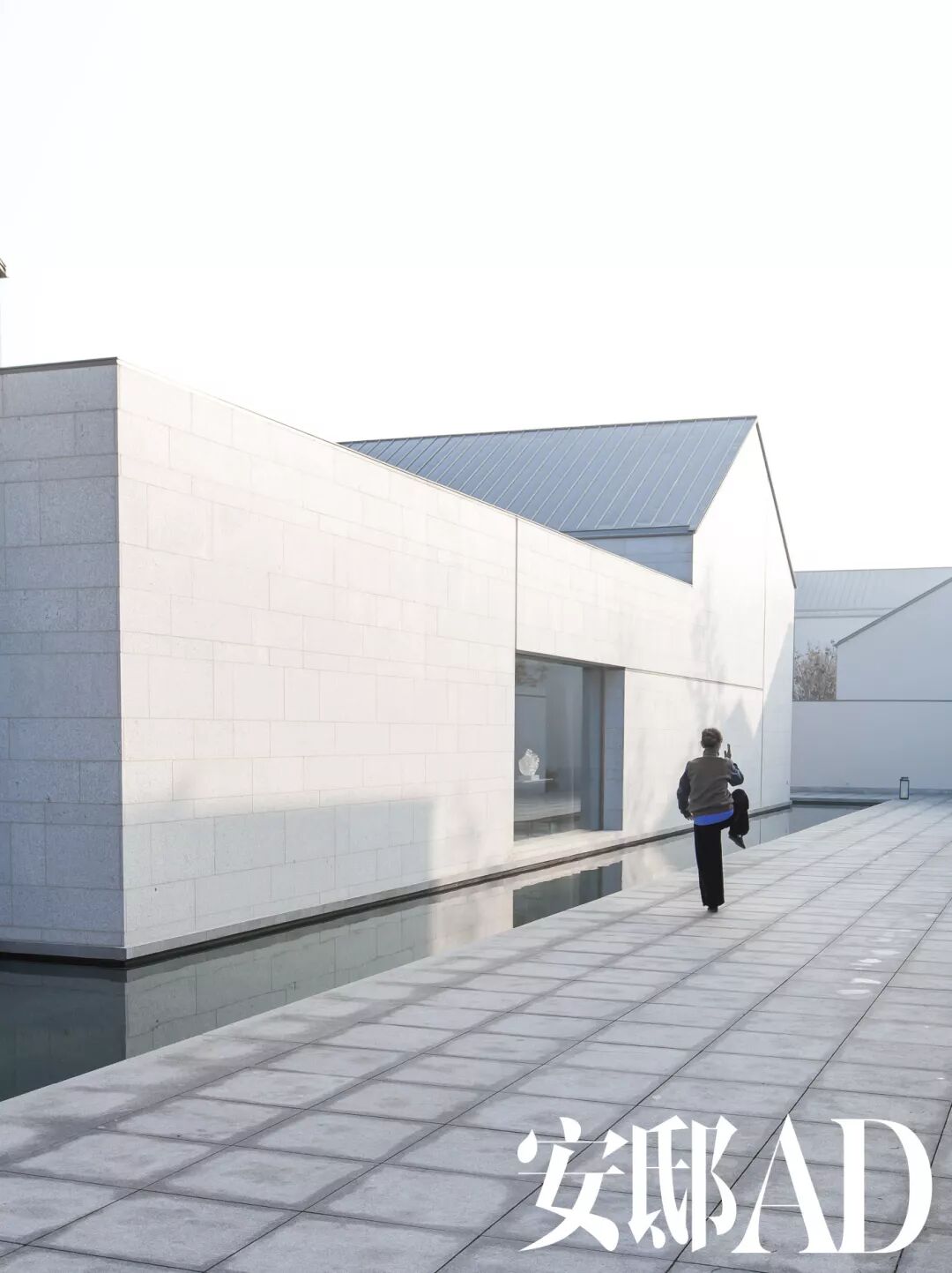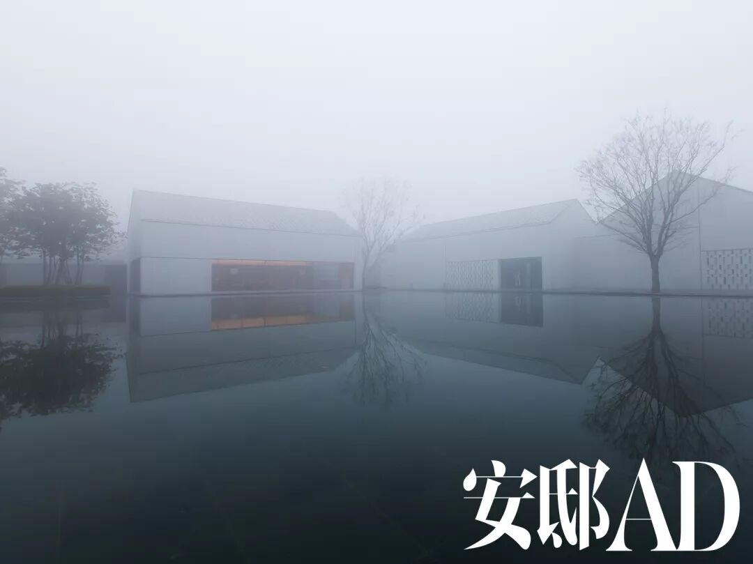 “和风细雨”般的柔美是江南水乡的题眼之一。在极致线条的几何造型中,如何令人体验圆融的柔美?其一便是整体色调的考量。在尊重传统水乡白墙黛瓦的基础上,设计师让墙之白暖了一度,变身为温柔的奶茶色,而“瓦”之黑弱了一度,变身为淡雅的灰蓝色。晴日里,奶茶色的墙面似乎能透出卡布奇诺的香醇;阴云中,它又呈现出蛋壳青的郁雅。但天光水影的表现自然不止于此,事实上,那个存在于倒影中的世界似乎更加趋向完美。