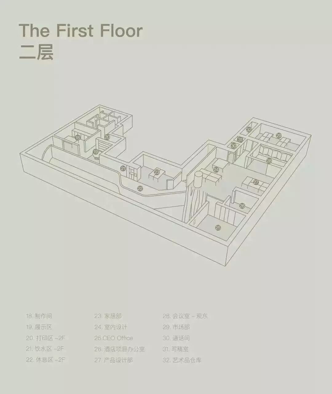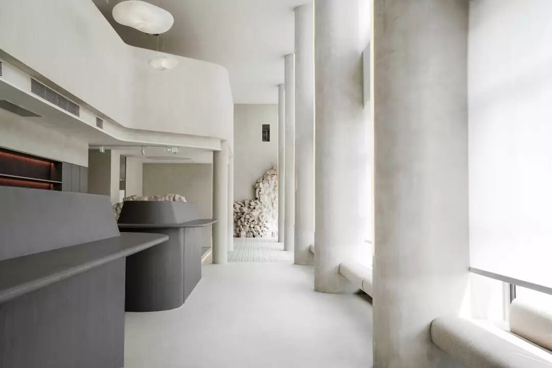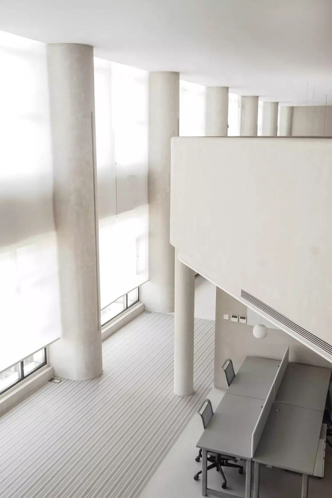 一层,颜色清浅舒适的回收型石材铺设满墙,数米高的南向落地窗让阳光可以眷顾到每个角落,伴着光影开始一天的工作,心情绝对美美哒。