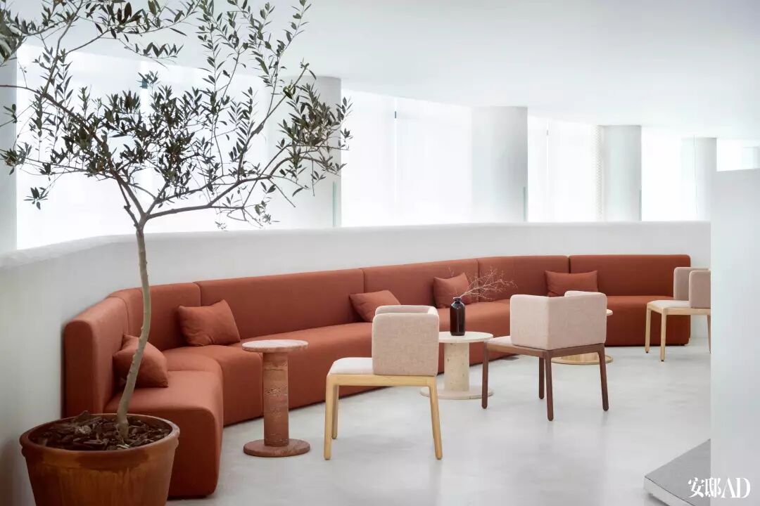 由周宸宸为梵几设计的Hug Chair环抱椅围合成二层的公共休憩区,在这里大伙儿聊天或偶尔累了午憩,橘色的沙发点亮了整个空间,常理之外带给人们一丝丝惊喜。