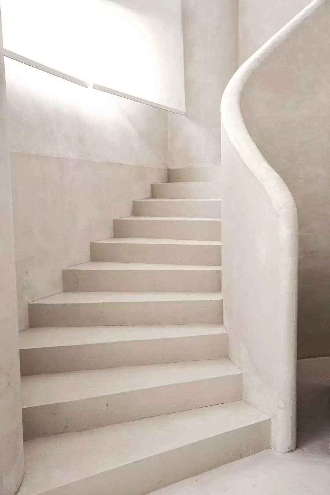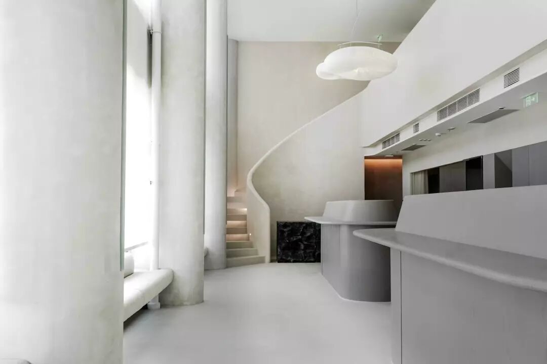 一层墙面的回收型石材延续至通向二层的楼梯扶手,盘旋而上的造型充满了曲线变化,让整个办公室都富有生命力。
