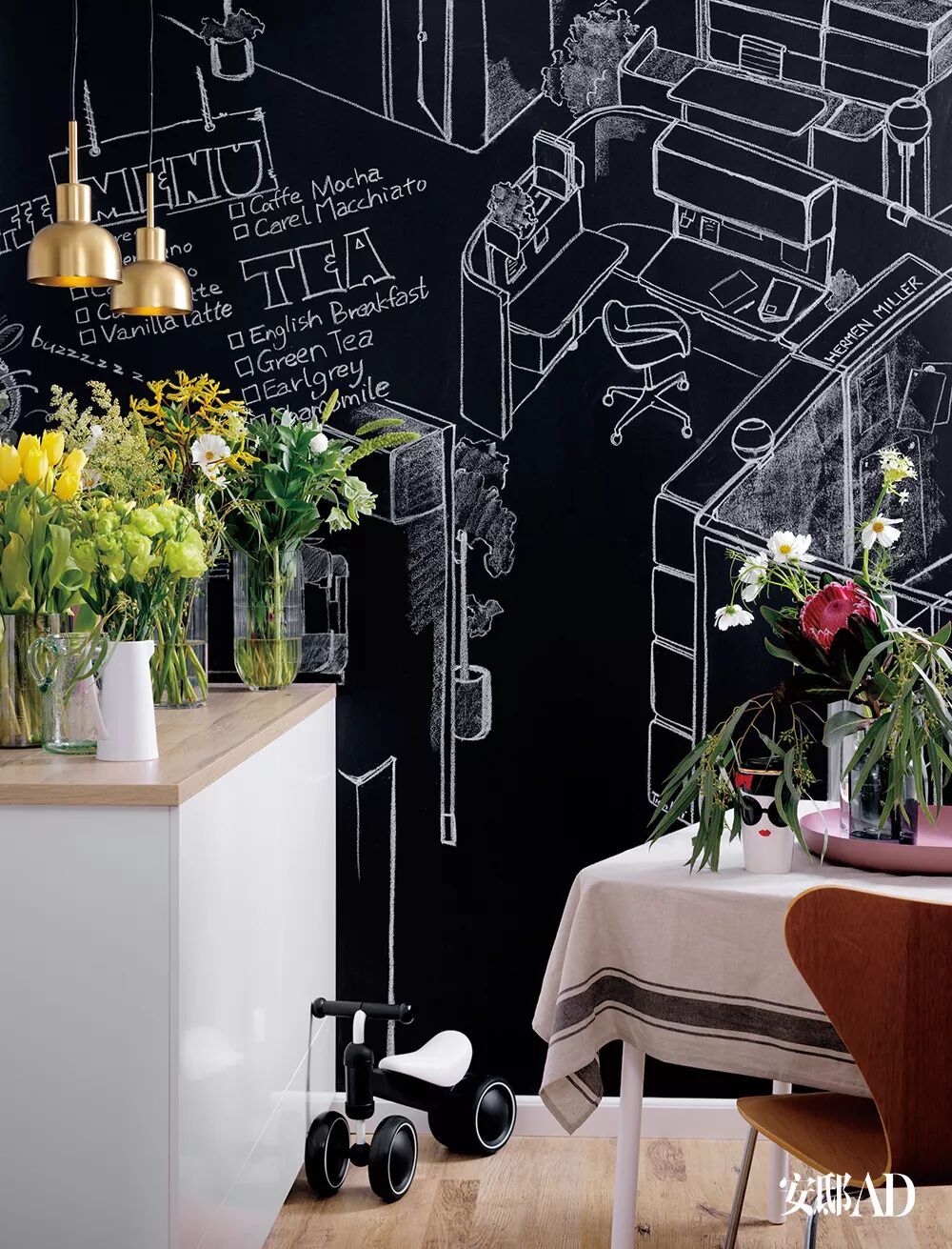 她将厨房从封闭式改造成开放式,以便在打理家务时可以与家人聊天,和宝宝交流;餐厅里摆放着一张既可喝酒聊天,又可用于工作阅读的大餐桌;餐厅的墙上设计了一块黑板,有朋友做客时,她会像咖啡馆一样,在黑板上写好家里可供应的饮品,咖啡、茶的种类。