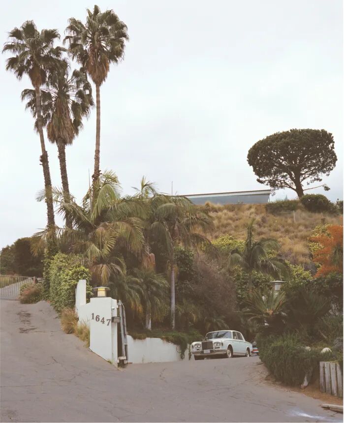 这两张照片是张悦站在洛杉矶豪宅外的街道上拍摄的:同一个地点,向上可见绿油油的棕榈树,向下视线穿过白色房子,可抵达远处的城市中心,但照片没有一个人,调和出一份安宁。