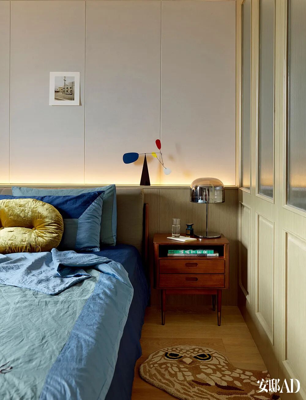 张悦和太太对卧室墙面的颜色一起挑了很久。陈暄喜欢调整颜色中灰的小细节,让整个屋子看上去舒服且不那么跳脱,张悦恰好也讨厌特别“钢铁直男”的东西。